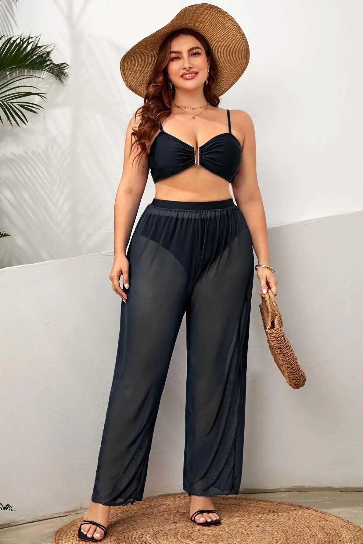 Plus Size Sheer Ruched Elastic Waist Wide Leg Beach Swimwear Cover Up Pants