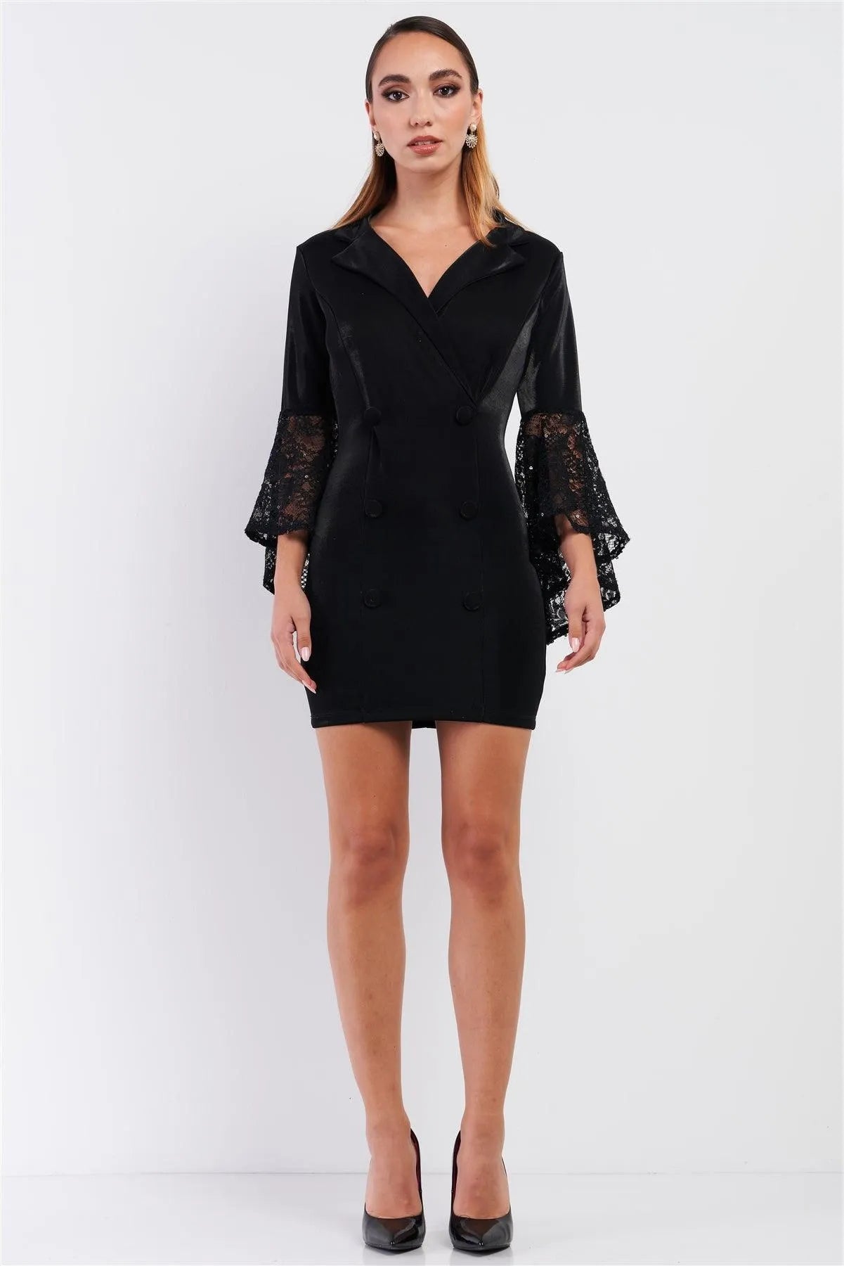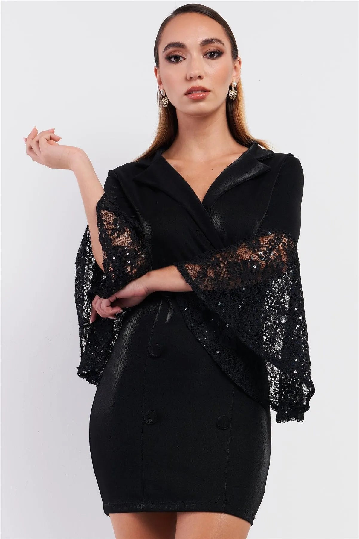 Black V-Neck Mesh Sequin Embroidered Sleeve Detail Mock Double Breast Blazer Mini Dress /3-2-1