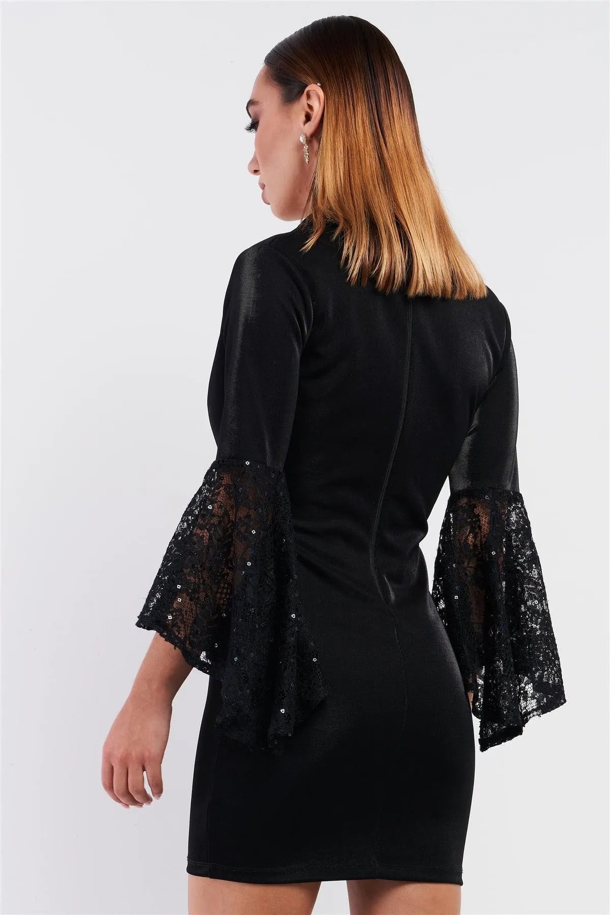 🖤 Item Features: Black, solid, V-neckline with lapel collar, mock double breast blazer front, mesh holographic sequin embroidered asymmetrical flare midi sleeve, back hook&eye and zipper closures, fitted, stretchy, mini length, chic, cocktail party & club wear, sexy, elegant, business chic, stylish, trendy, glamorous, fall/winter chic collection