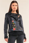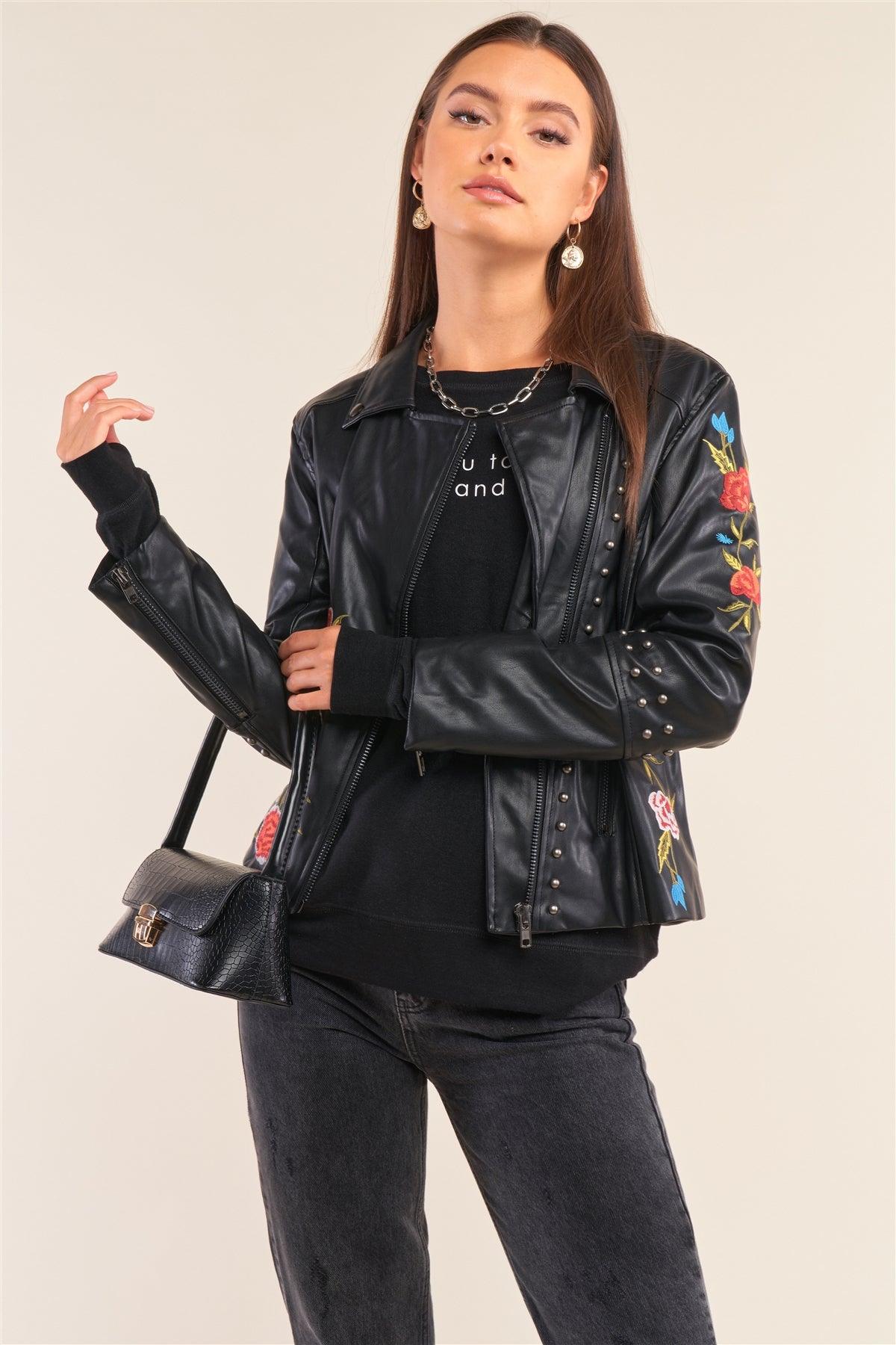 Black Metal Beads Detail Floral Embroidery Long "Tattooed" Sleeve Vegan Leather Jacket /1-1-1-1-1