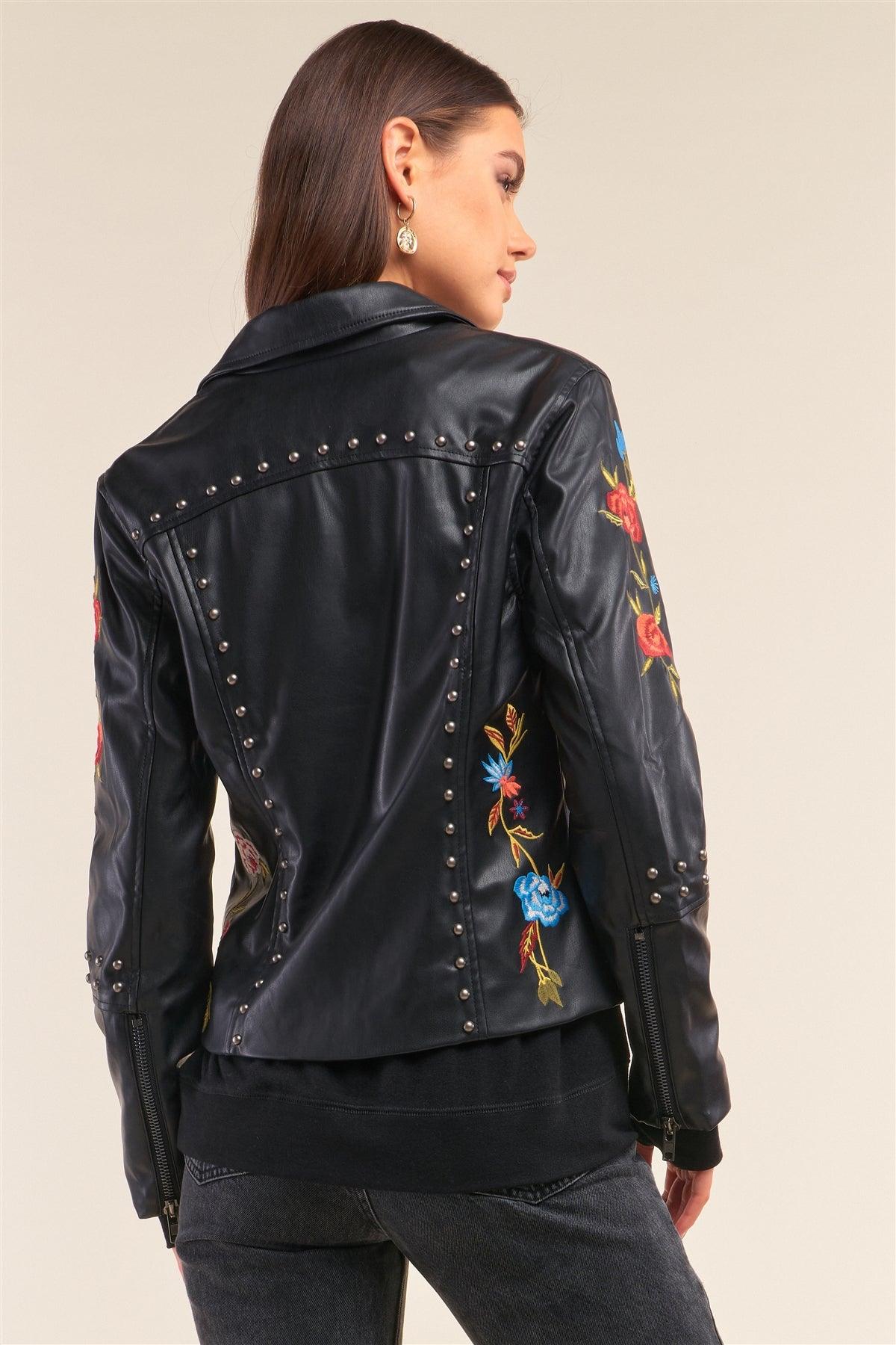 🖤 Item Features: Black, vegan leather, buttoned collar, multicolor floral embroidery detail all over, oblique zipper fly closure, sleeves with zipper closure, metallic beads detail on sleeves, in the front and in the back, lined, regular fit, zipper pockets, casual, stylish,