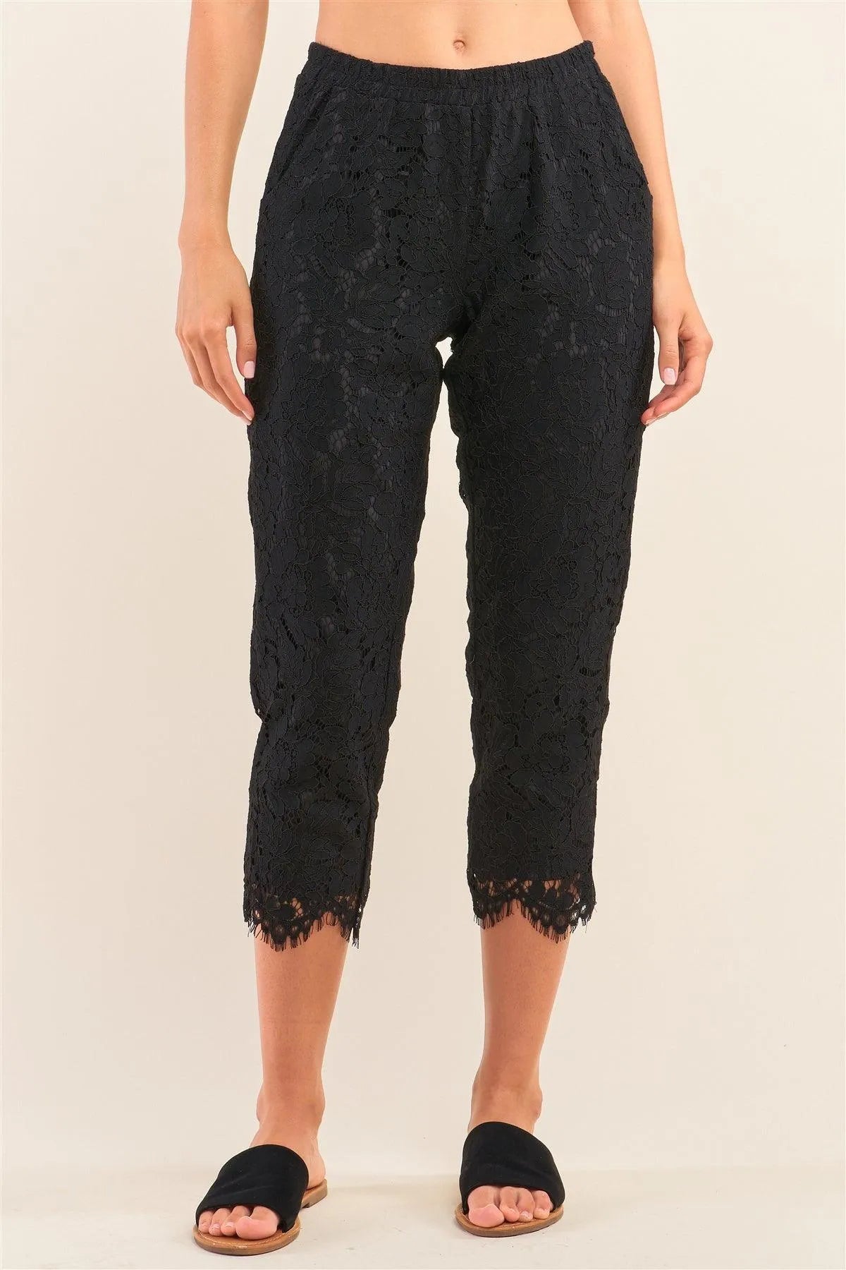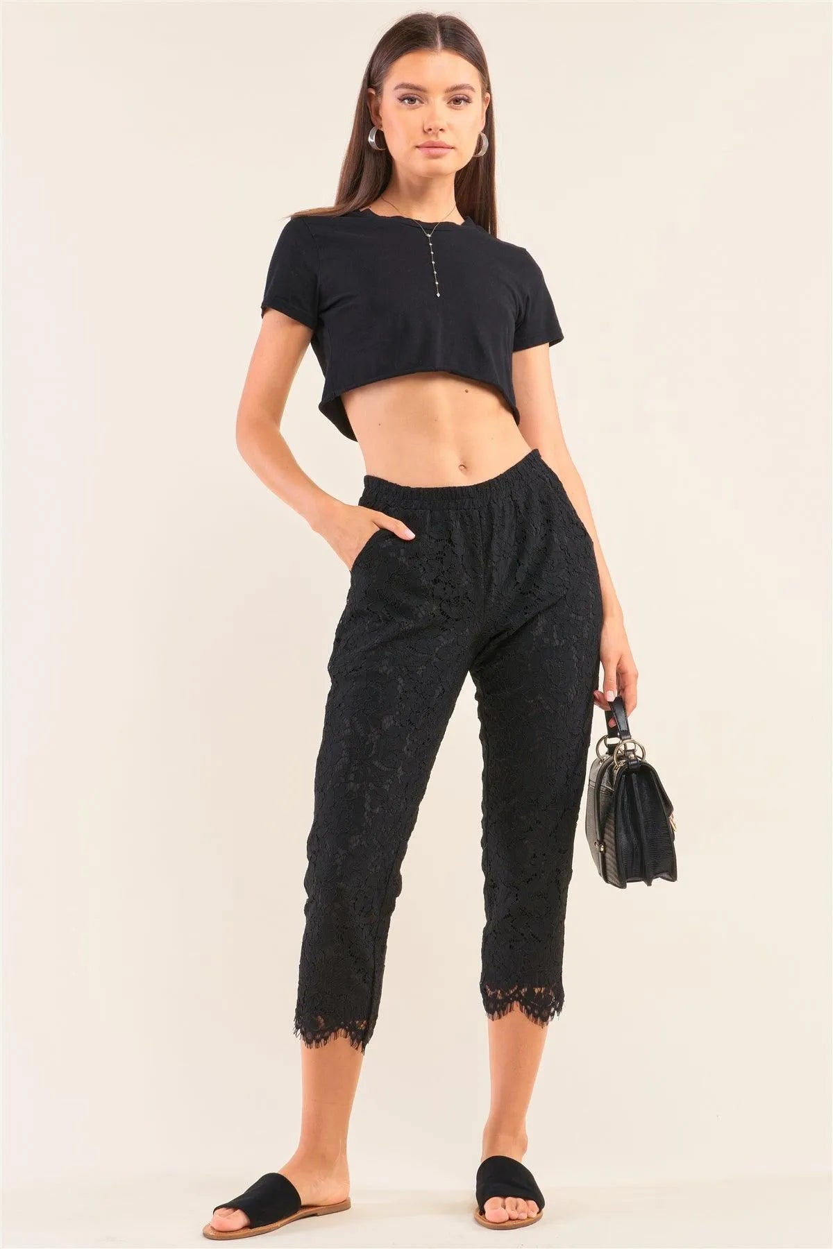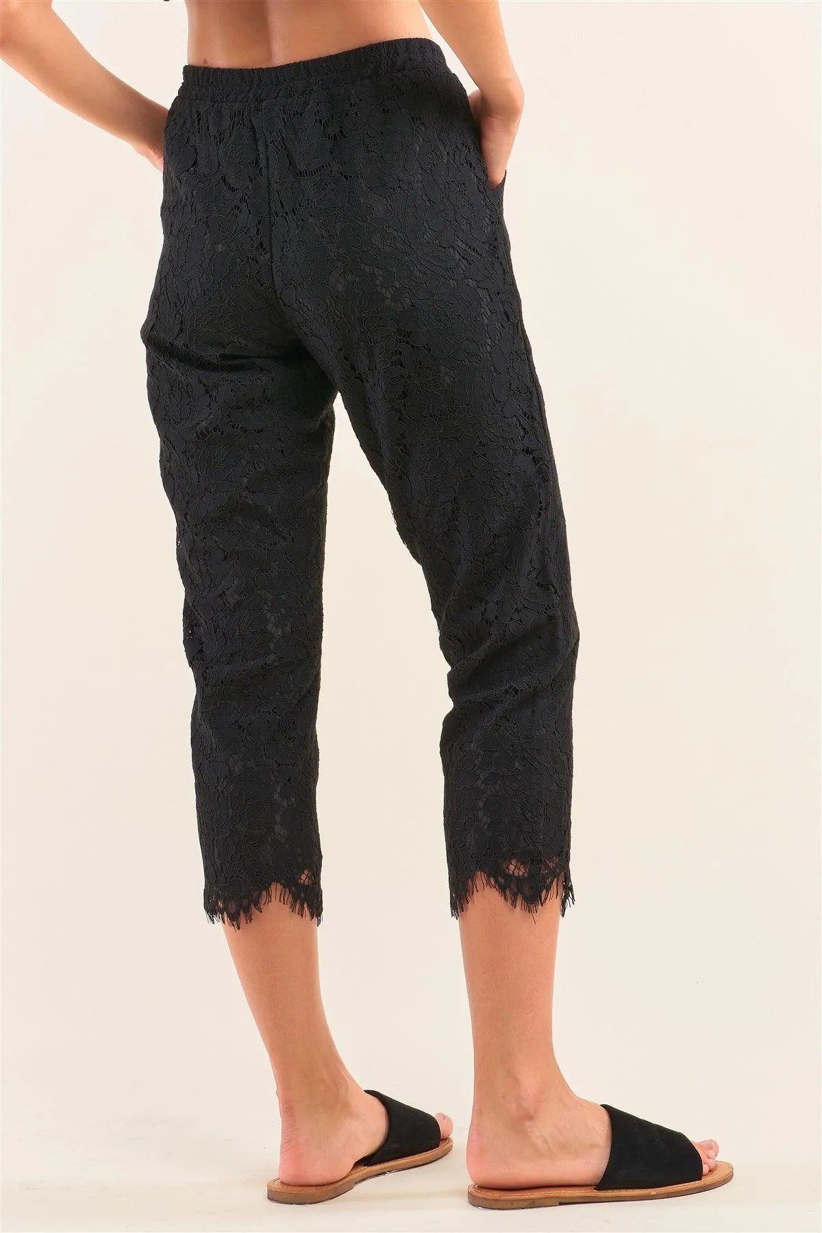 Black Mid-Rise Crochet Lace Shredded Scallop Hem Capri Pants /1-2-2-1