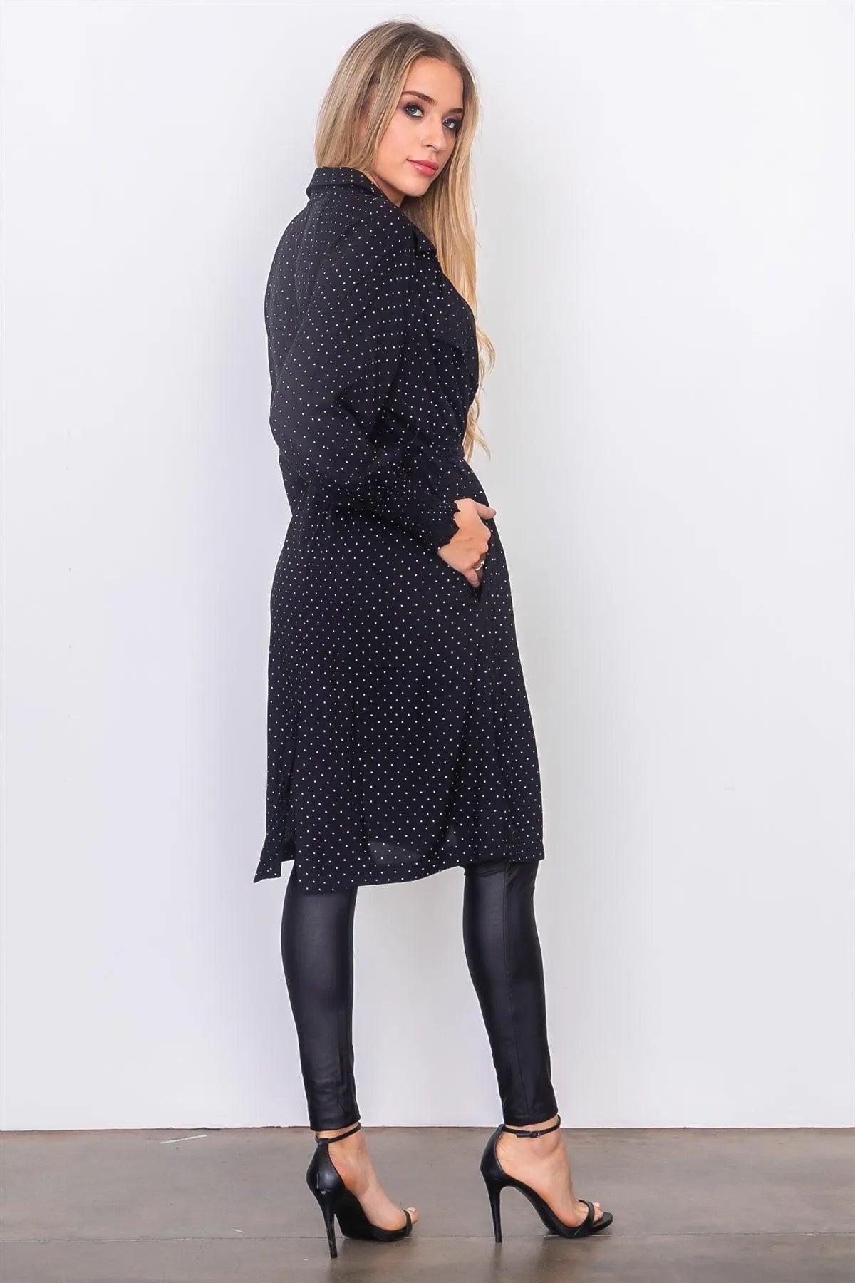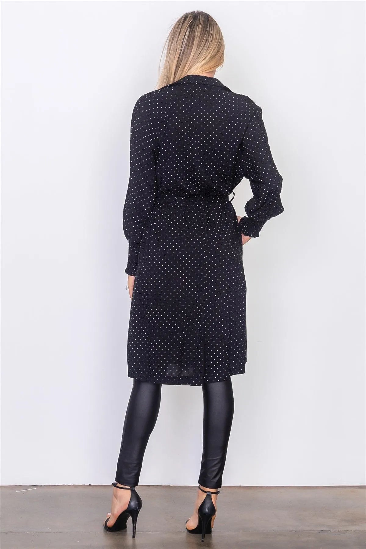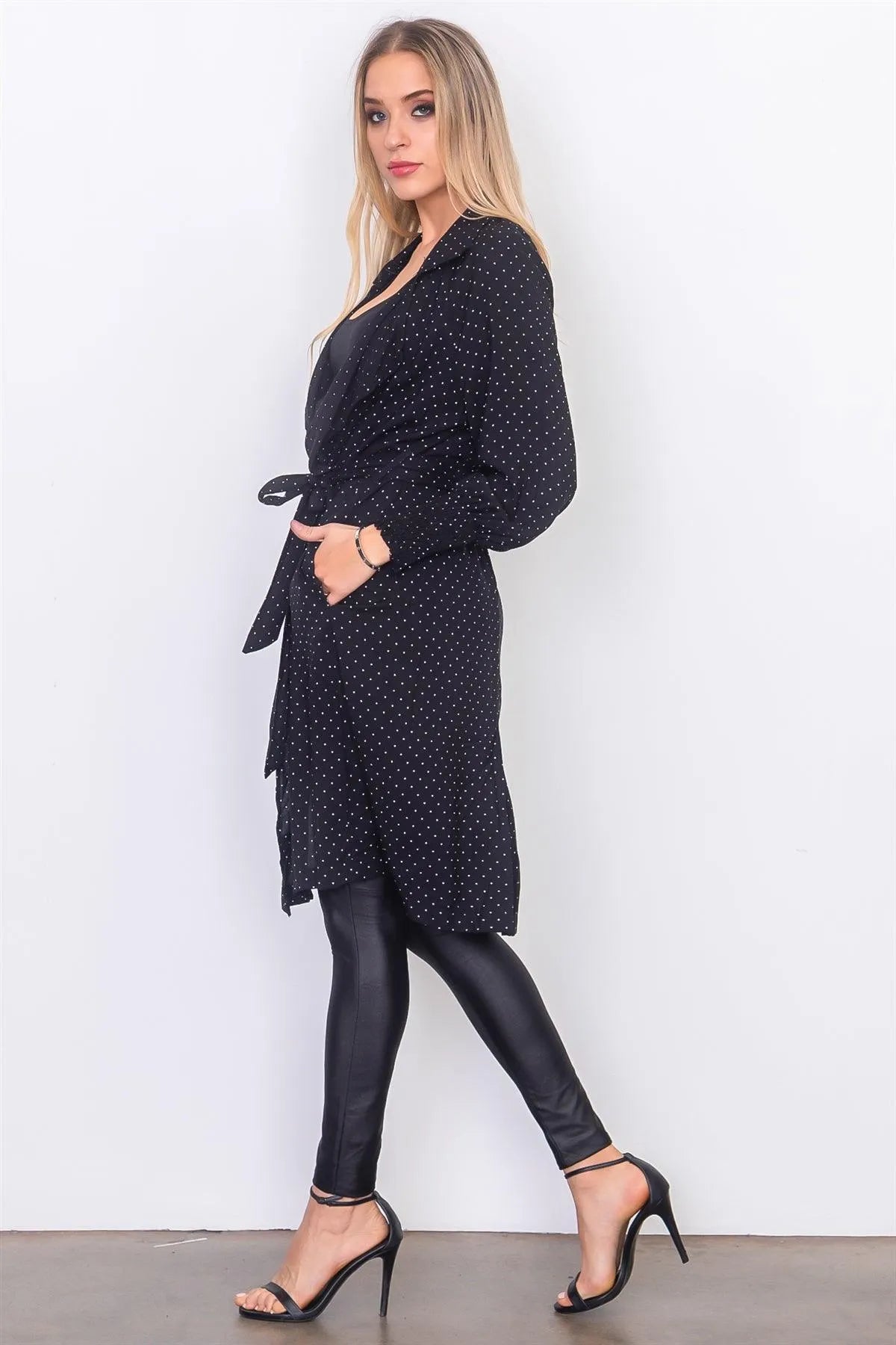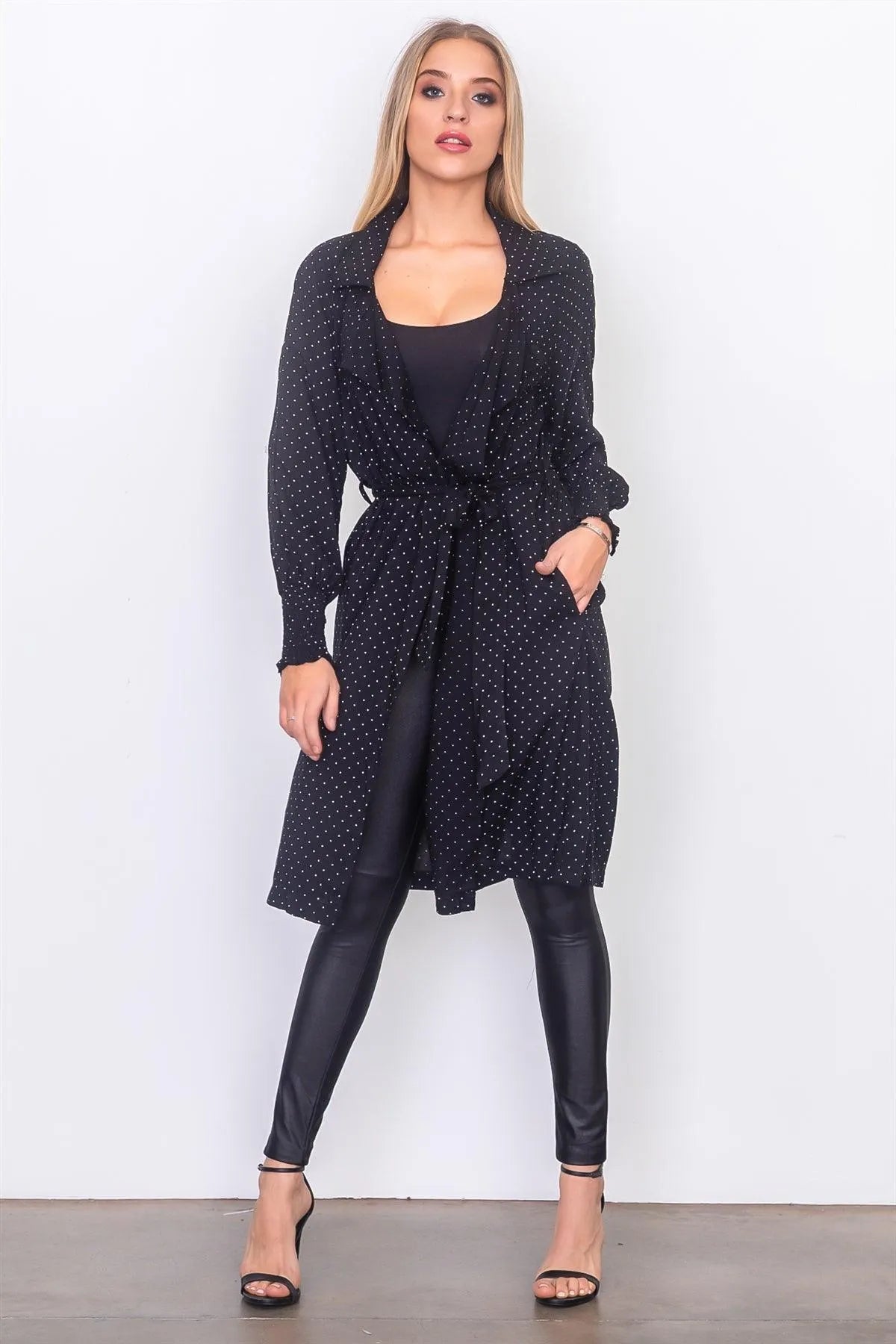 Cardigan features: unlined, slightly sheer, polka dots print allover, open front, side pockets, belted at waist, removable strap, long sleeves, dropped shoulder, shirred elastic cuffs, back hem split.Model is 5'9" and wearing small (Waist: 28", Bust: 34C", Hips: 36" )Small Size Item Measurements: Length: 42", Sleeve Length: 24"