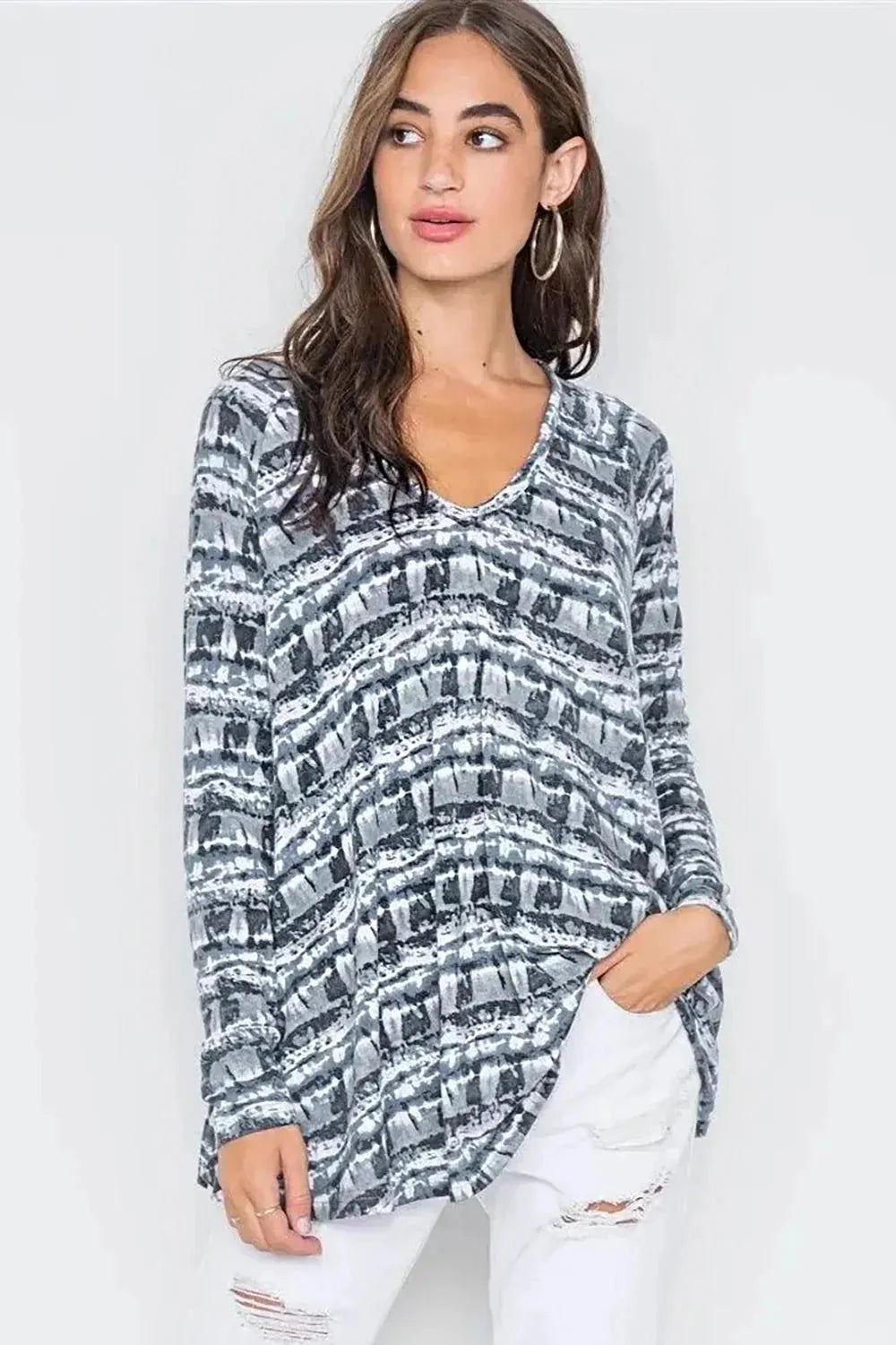 Elevate your boutique's collection with our trendy tie-dye V-neck top. This versatile piece features a stunning gray and white pattern that your fashion-forward customers will adore. The relaxed silhouette and soft fabric make it a must-have addition to any wardrobe, perfect for boutique owners looking to stock high-demand everyday essentials with a stylish edge.