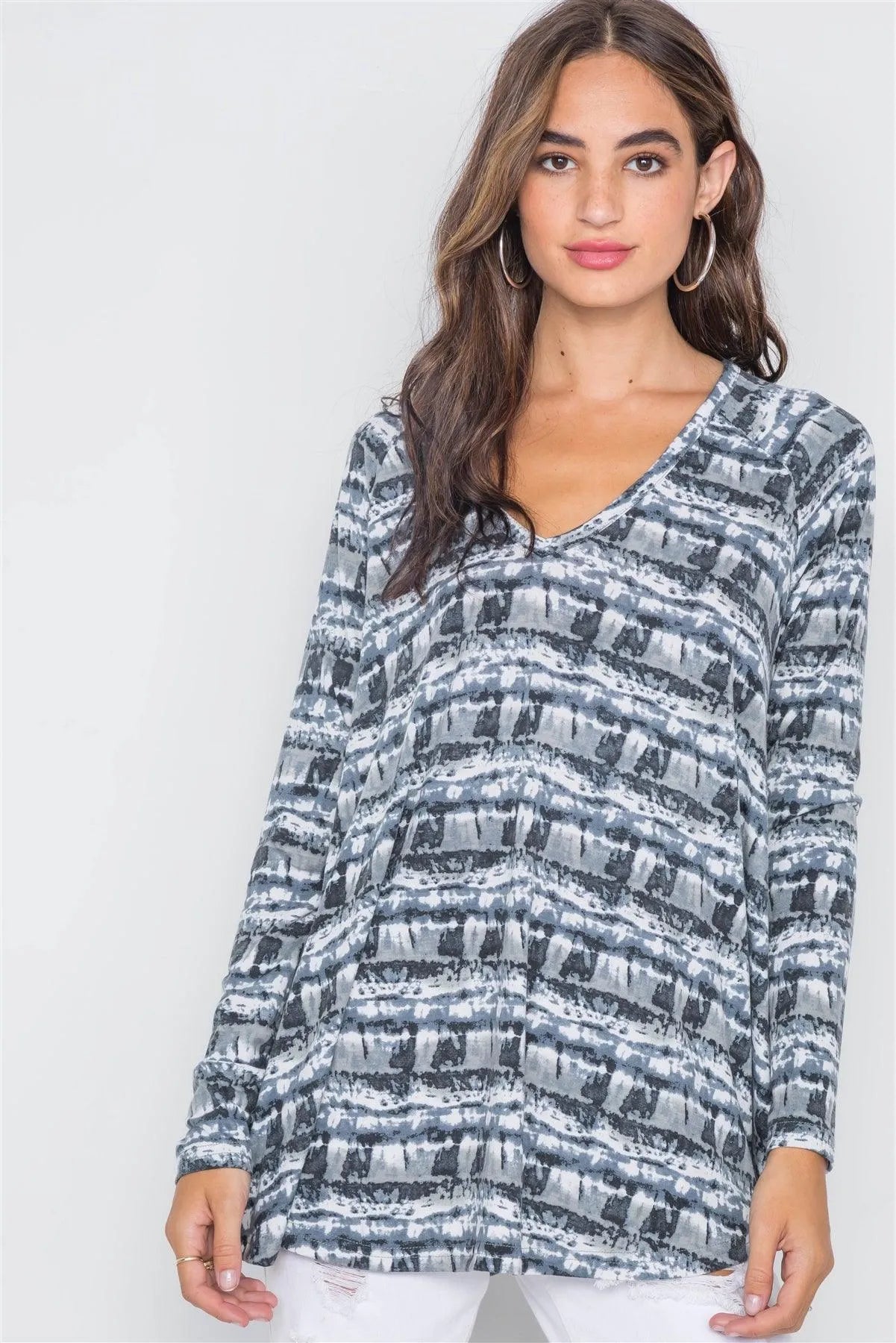 Modern Gray Tie-Dye V-Neck Relaxed Fit Long Sleeve Top