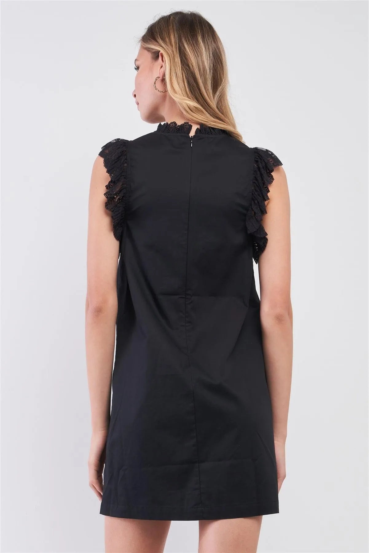 🖤 Item Features: Black, sleeveless, mock neckline, ruffle lace trim, back seamless zipper closure, straight-cut fit, mini length, relaxed, unlined, non-sheer, non-stretch, casual chic, night out, date night, party look, spring/summer collection
