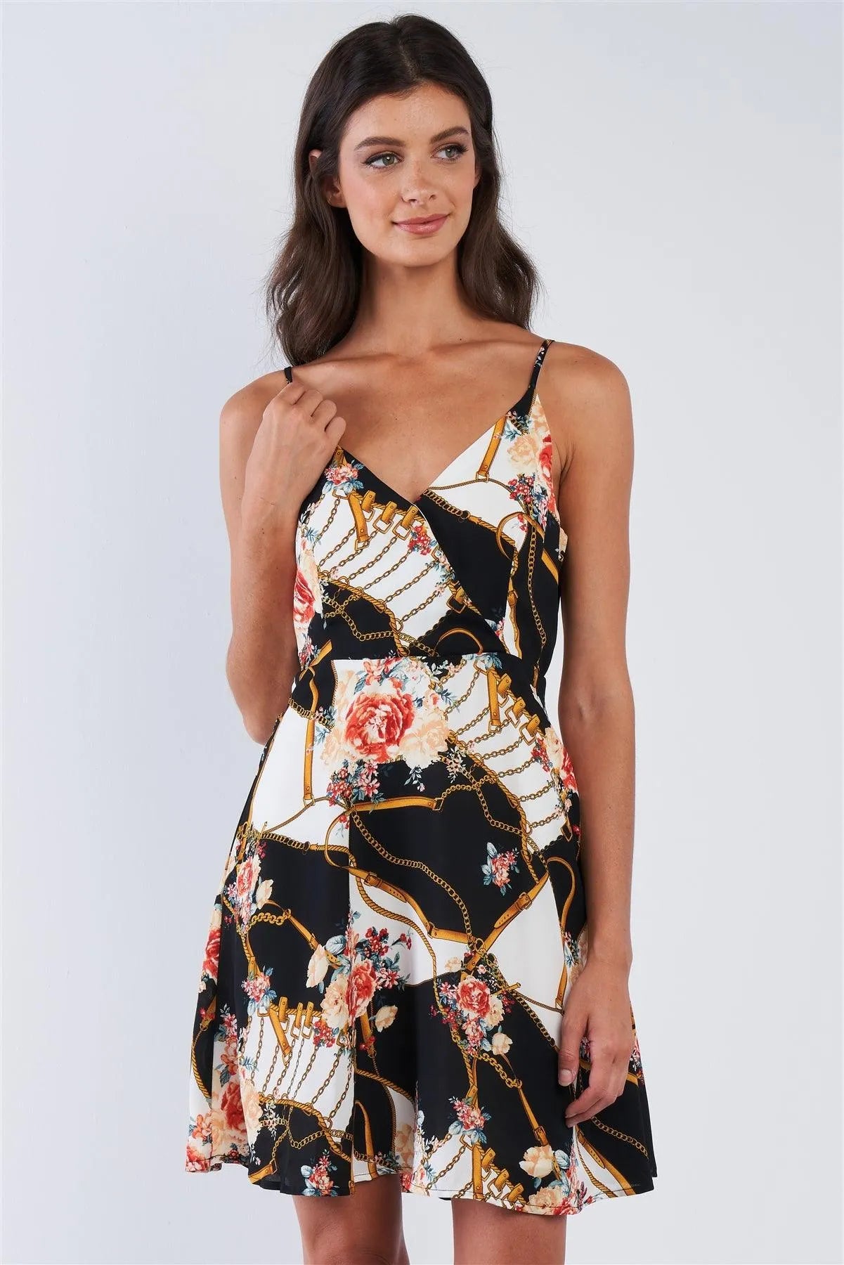 Dress features: Black multi print, floral, belt & chain print, bust darts, surplus neckline, front clasp closure, hidden back closure, semi-sheer, lined, adjustable cami straps, mini length.Model is 5'8 wearing a size Small ( Waist: 26", Bust: 32B, Hips: 34")Small Size Item Measurements: Length: 35", Bust: 30"true to size