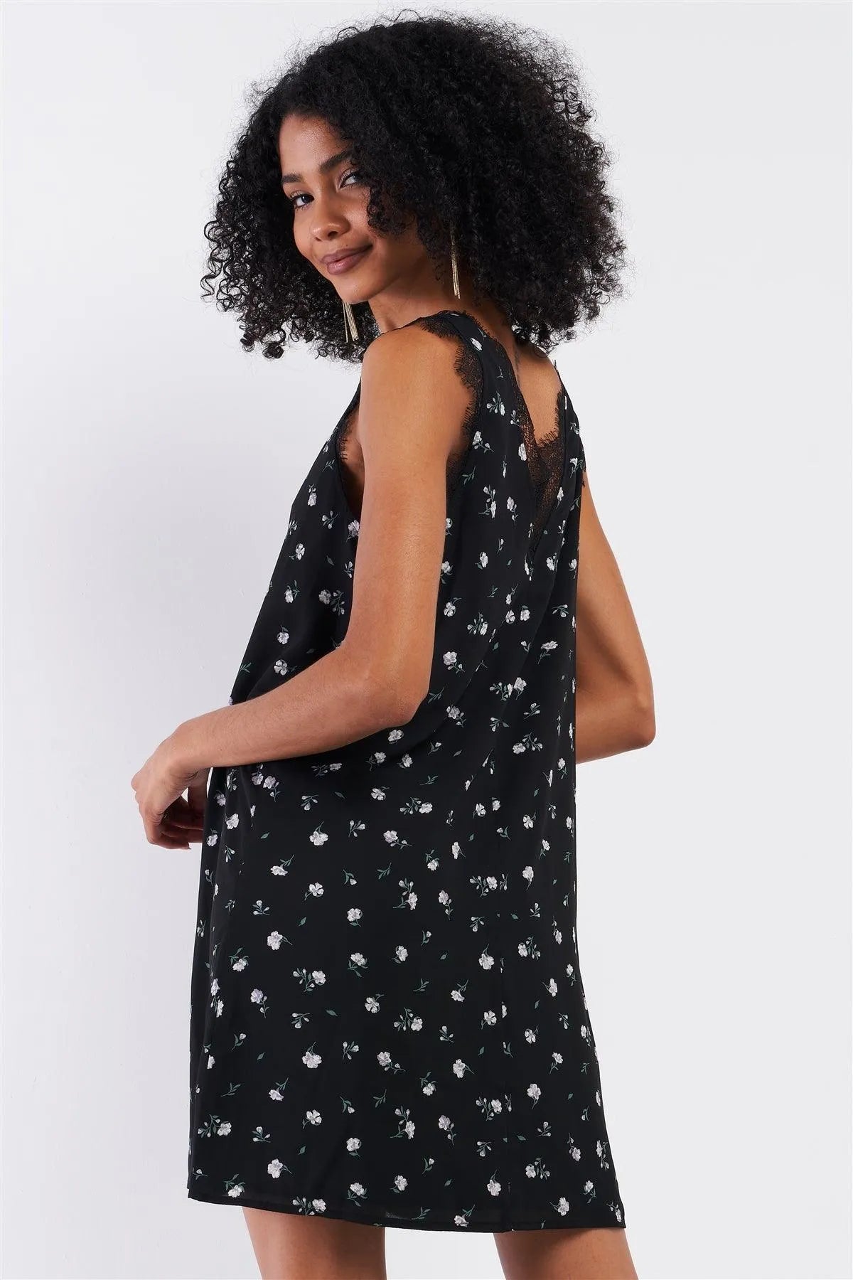 Black Multi Floral Print Sleeveless Lace Trim Mini Shift Dress