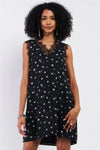 🖤 Item Features Black, floral multi print, sleeveless, lace trim detail, front and back V-neckline, mini length, lined, non-sheer, non-stretch, relaxed fit, bohemian style, festival look, silky feel, stylish, cute, date look, casual