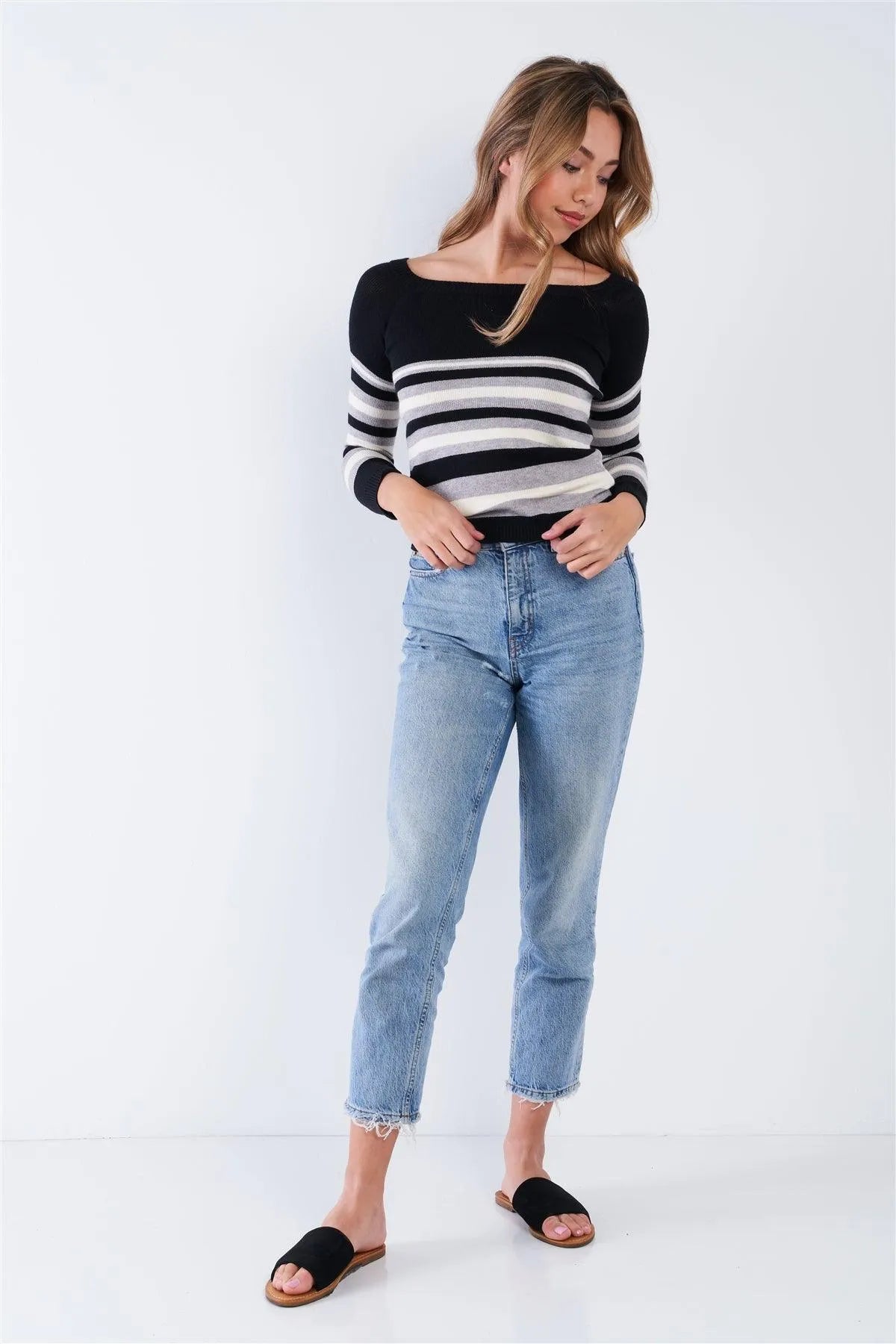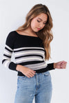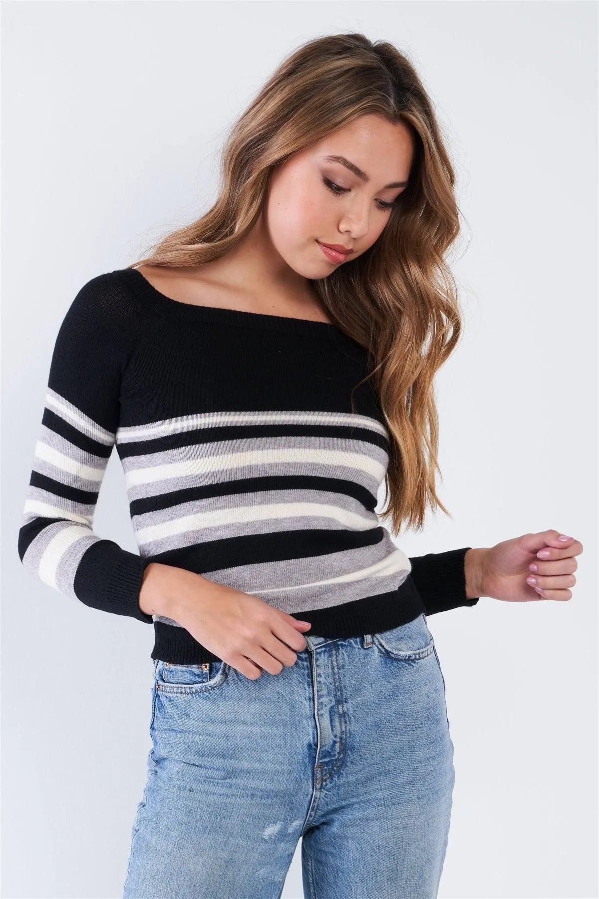 🖤 Item Features: Solid black, ivory, grey multi stripe, square neckline, ribbed collar, hem and cuffs, knit construction, long sleeve, unlined, stretchy, causal, office wear, retro.