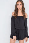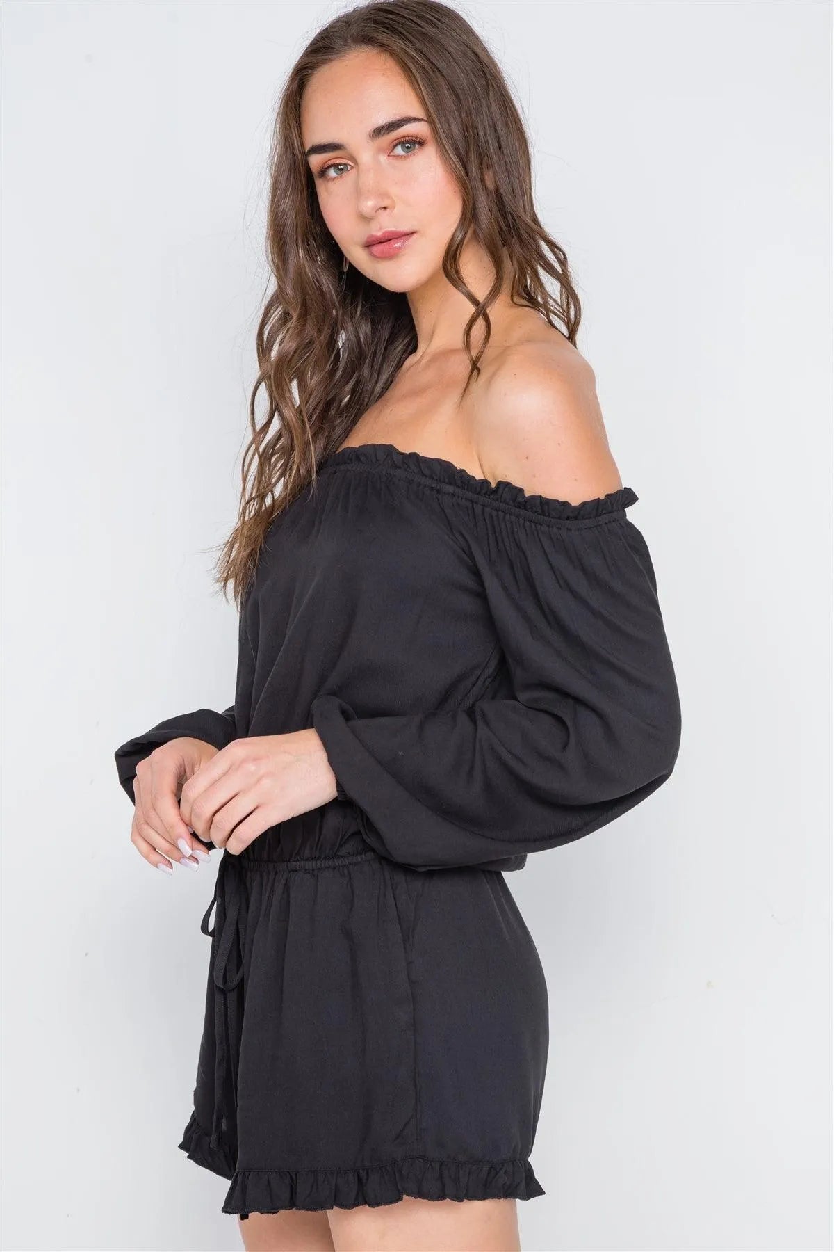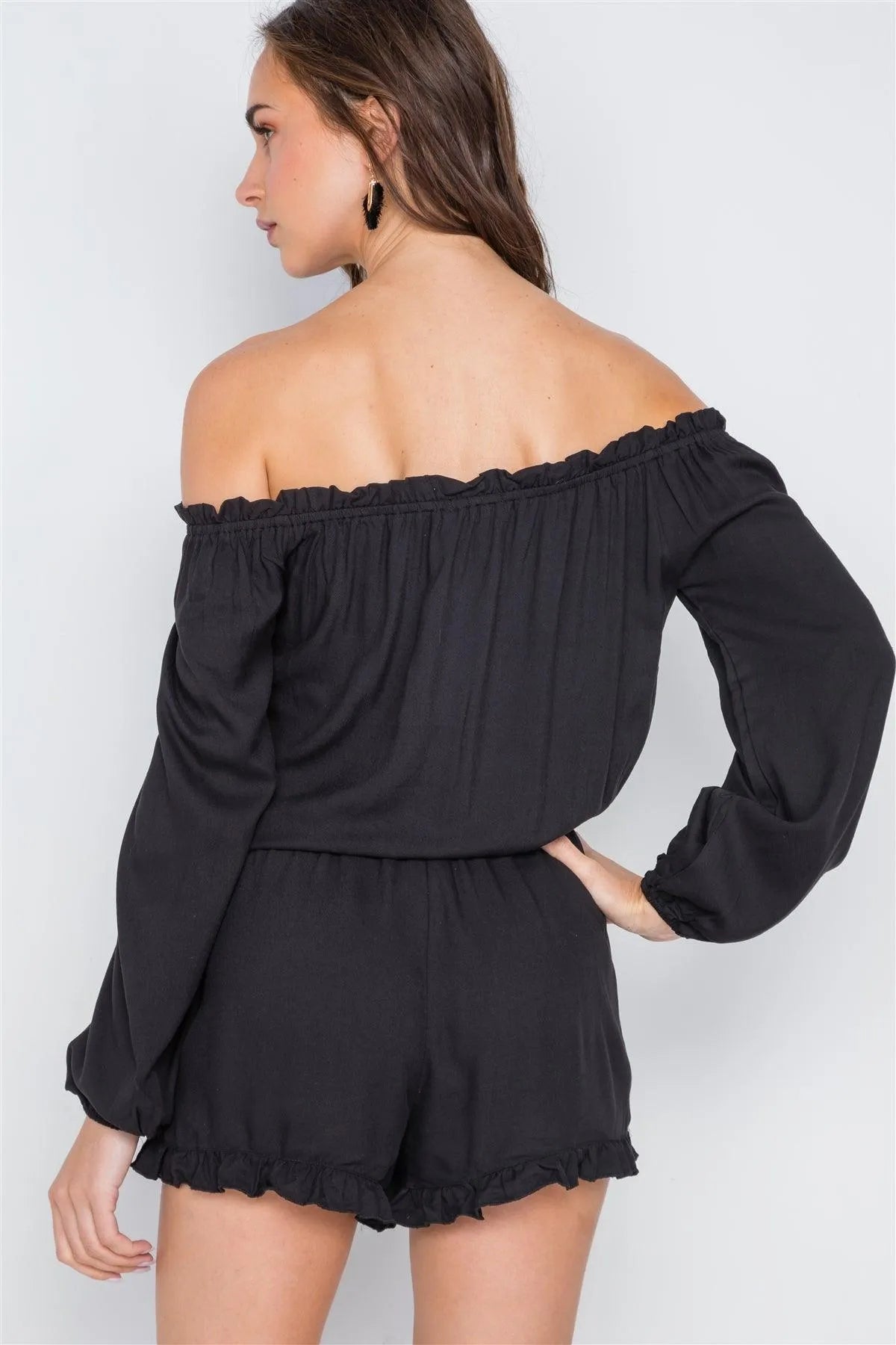 Black Off-The-Shoulder Ruffle Long Sleeve Romper /2-2-2