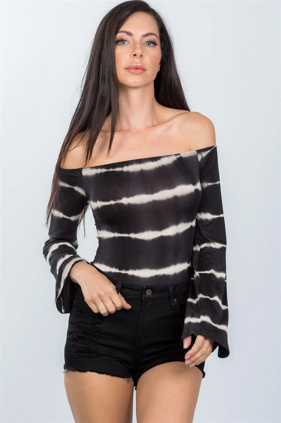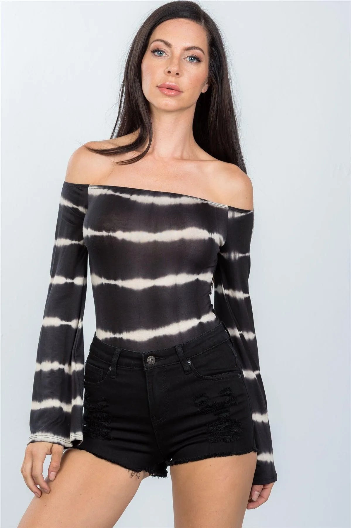 Black Off The Shoulder Tie Dye Boho Bodysuit
