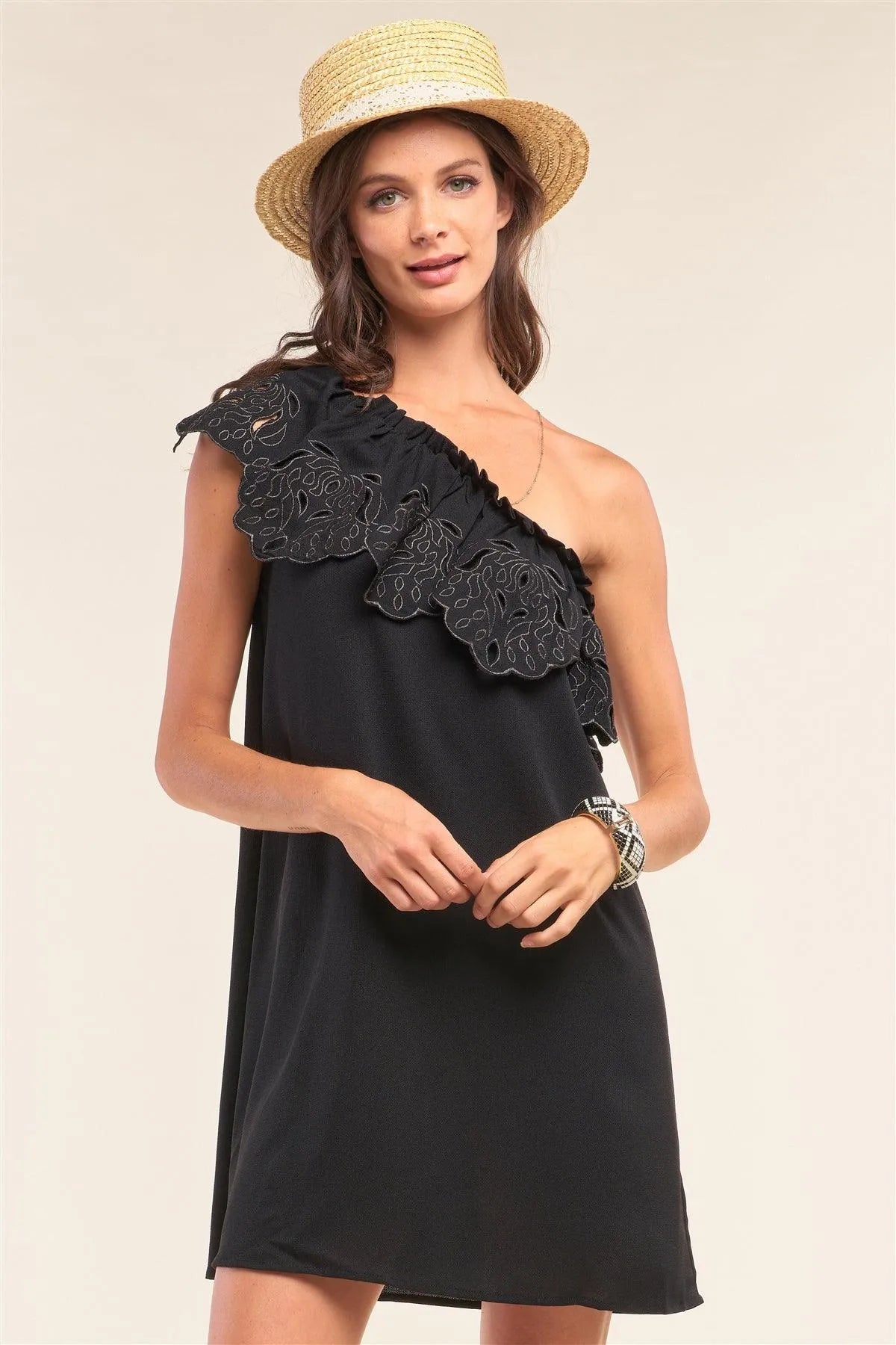 Black One-Shoulder Flare Hem Eyelet Embroidery Detail Sleeveless Relaxed Fit Mini Dress /1-2-2-1
