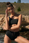 Black One-Shoulder Lace-Up Side Tube Top & High-Waisted Lace-Up Front Bikini Bottom Swimsuit