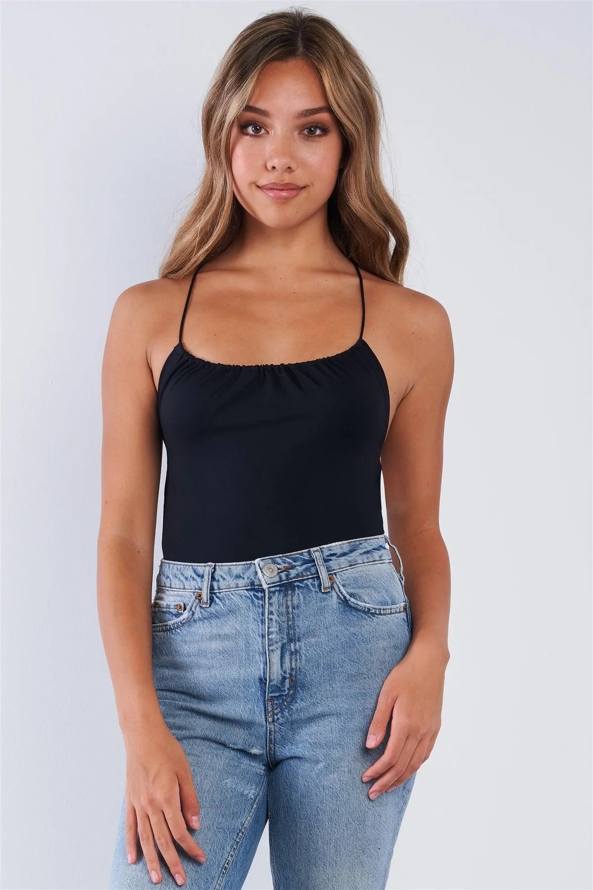 Black Open Back Criss Cross Stretchy Spandex Bodysuit /3-2-1