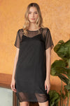 Black Organza Short Sleeve Round Neck Straight Cut Self-Tie Side Detail Knee Length Dress /3-2