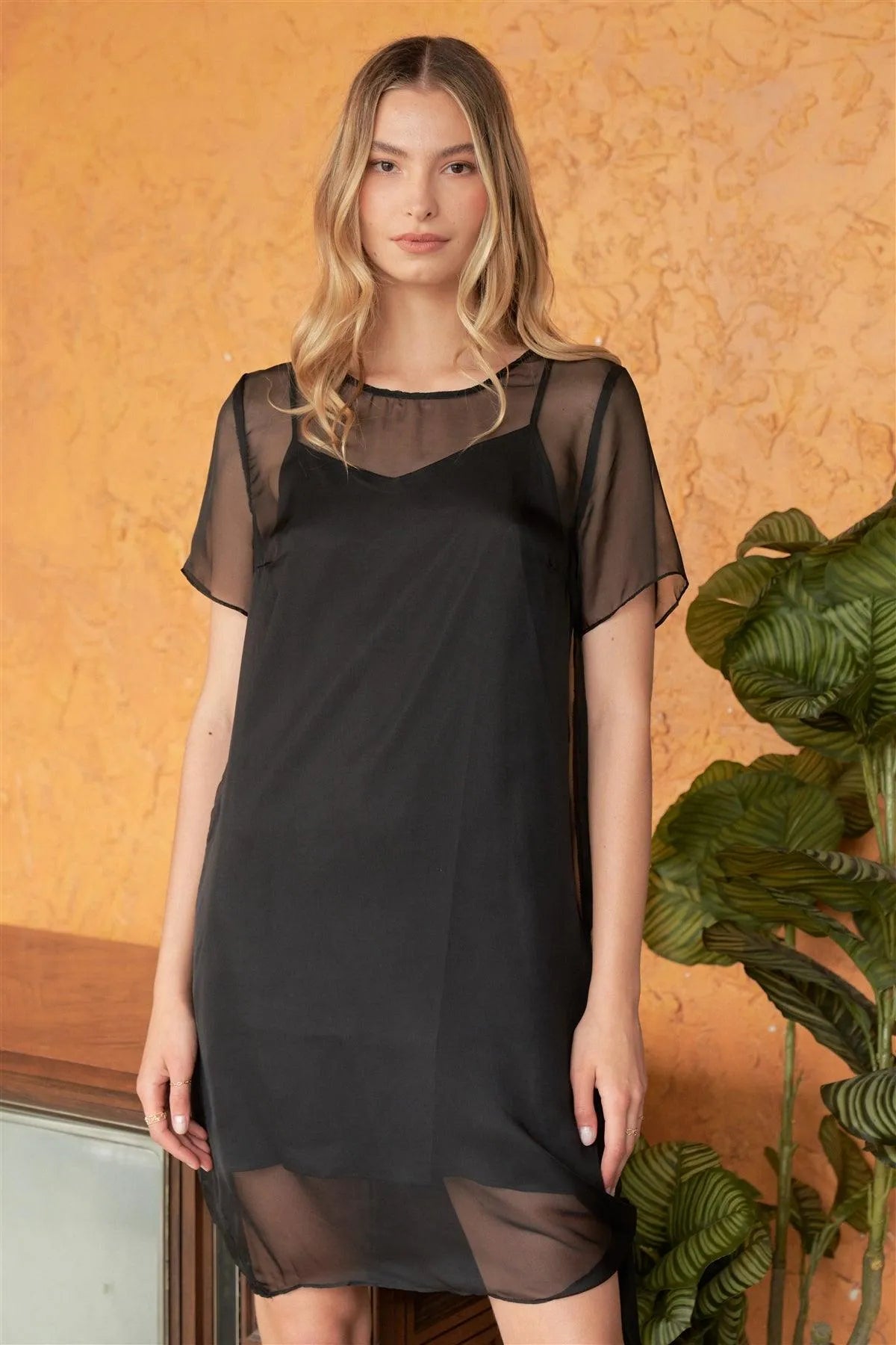 🖤 Item features: Black, solid, see-through, short sleeve, round neck, straight cut, self-tie side detail, back keyhole with hook & eye closure, lined with seamless, v-neck, sleeveless mini dress with adjustable shoulder straps, non-stretch, trendy, cool, elegant, minimalistic