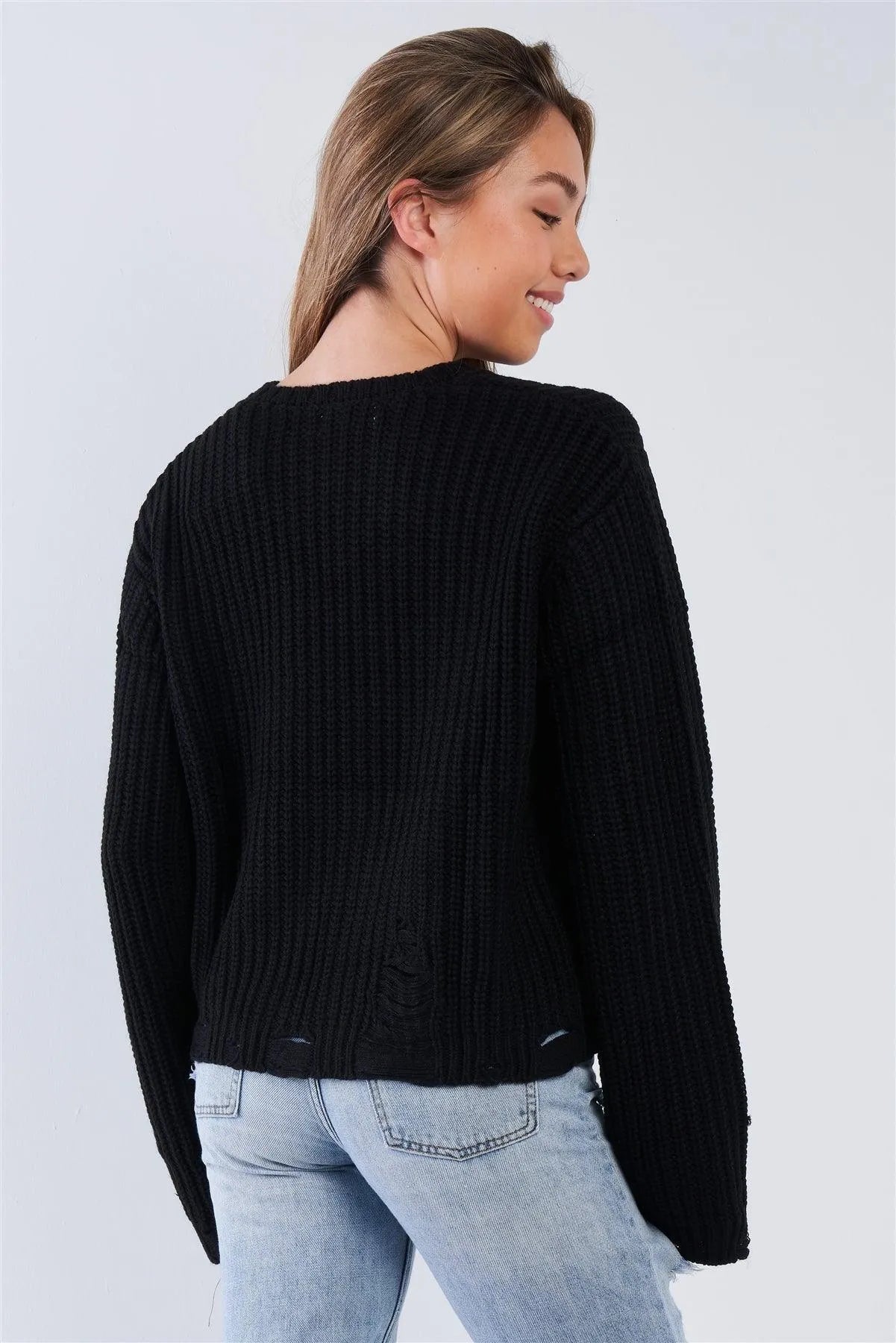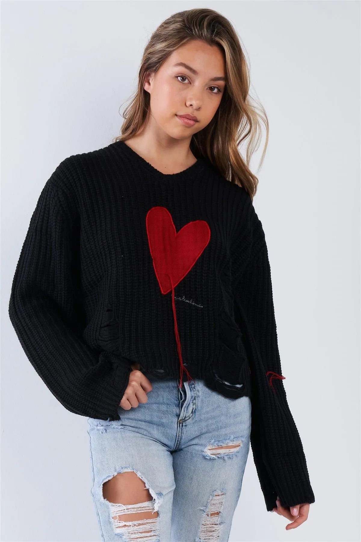 Black Over Size Fit Embroidered Heart Distressed Sweater /2-1-2-2