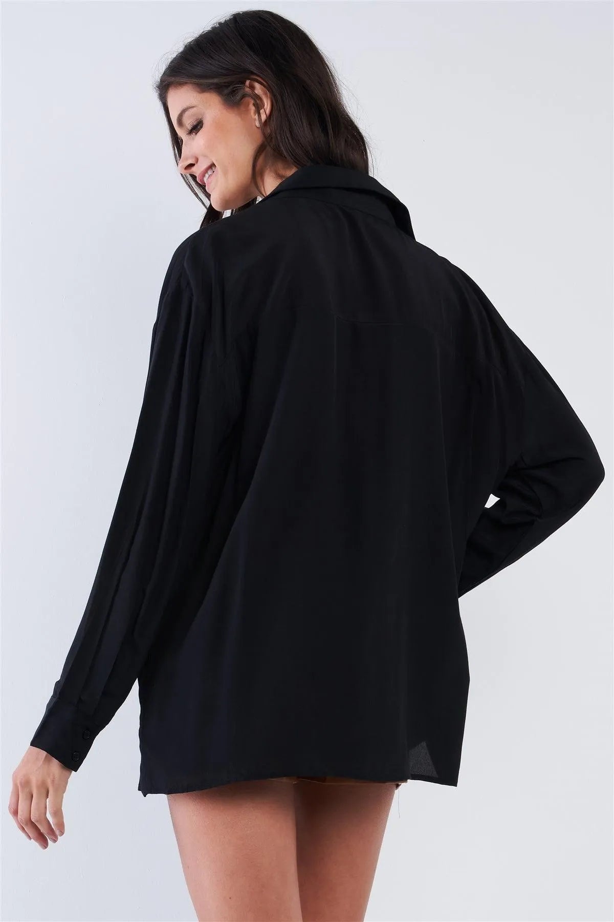 Black Oversized Button Down Off-The-Shoulder Long Sleeve Boyfriend Style Top /1-2-2