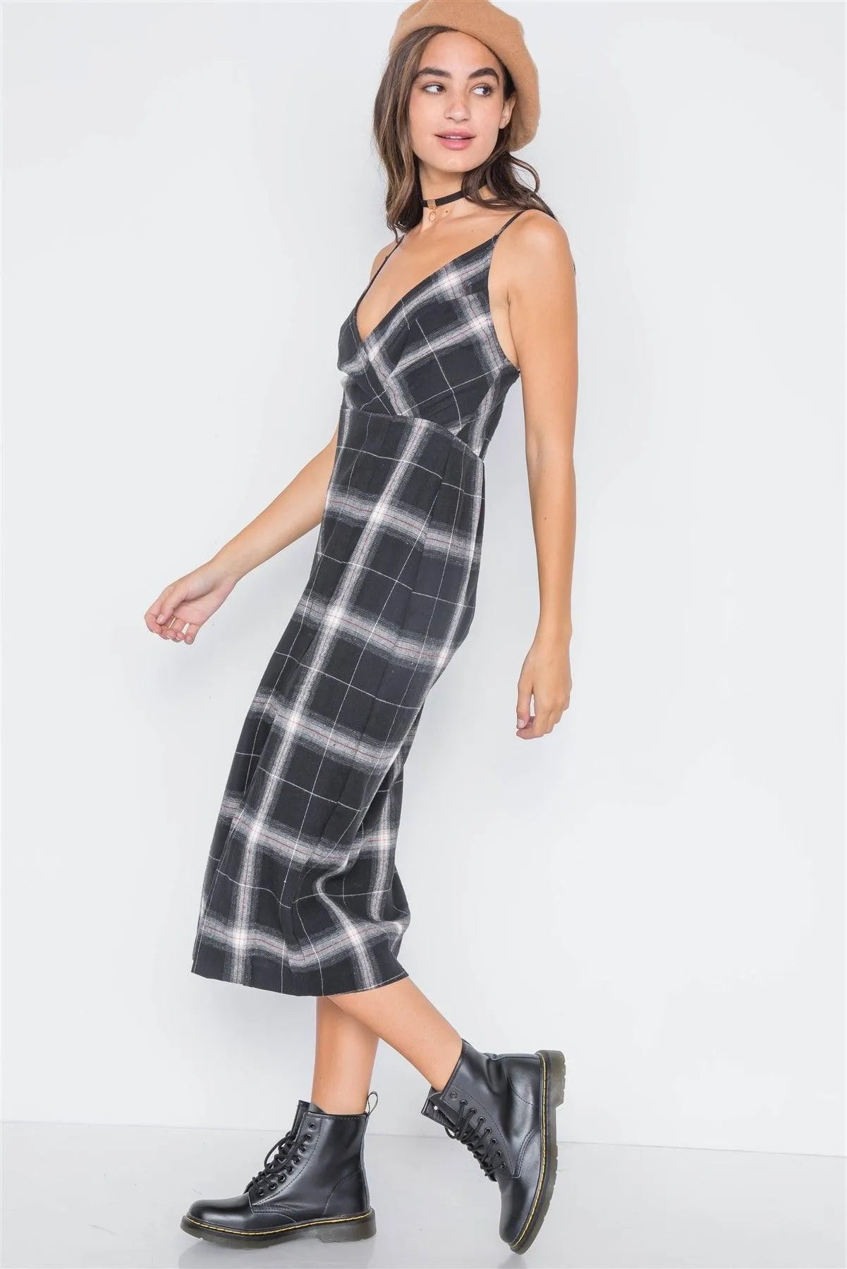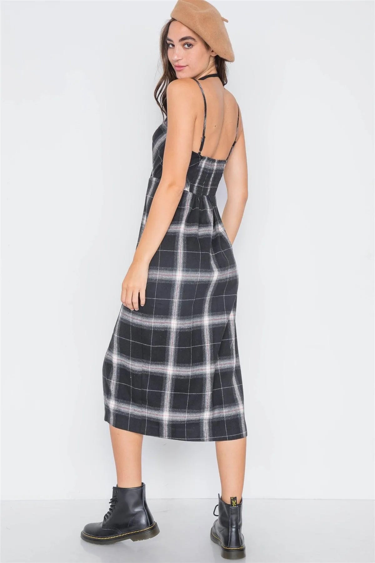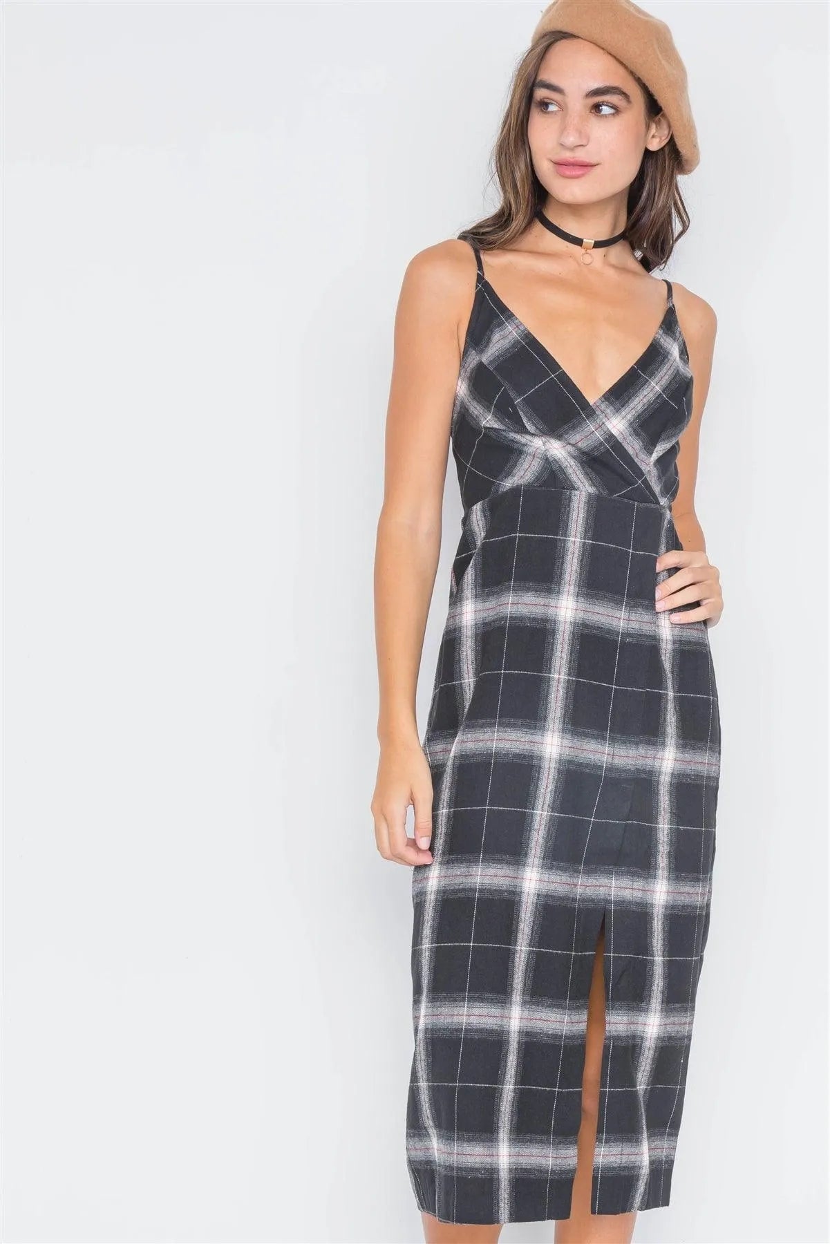 Black Plaid Cami Straps Front Slit Midi Dress /3-2-1