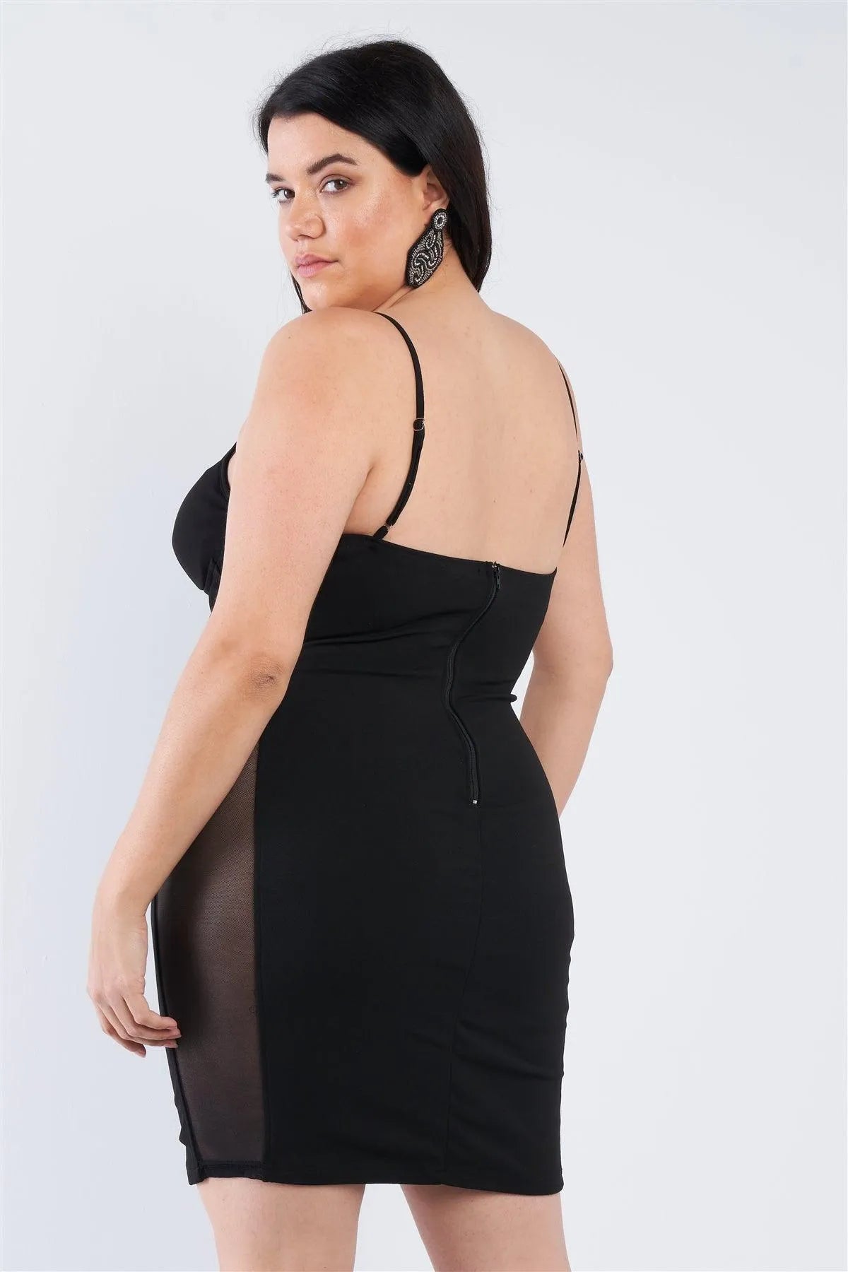 Dress Features: Solid, black, lace neckline, spaghetti strap, mini, mesh side seams, stretchy, unlined.Model is 5'6 and wearing a 1X ( Bust: 38DD", Waist: 39", Hips: 50")Item Measurements: Length: 35" , Bust: 38"Item comes pre-packed with hang tagsTrue to size