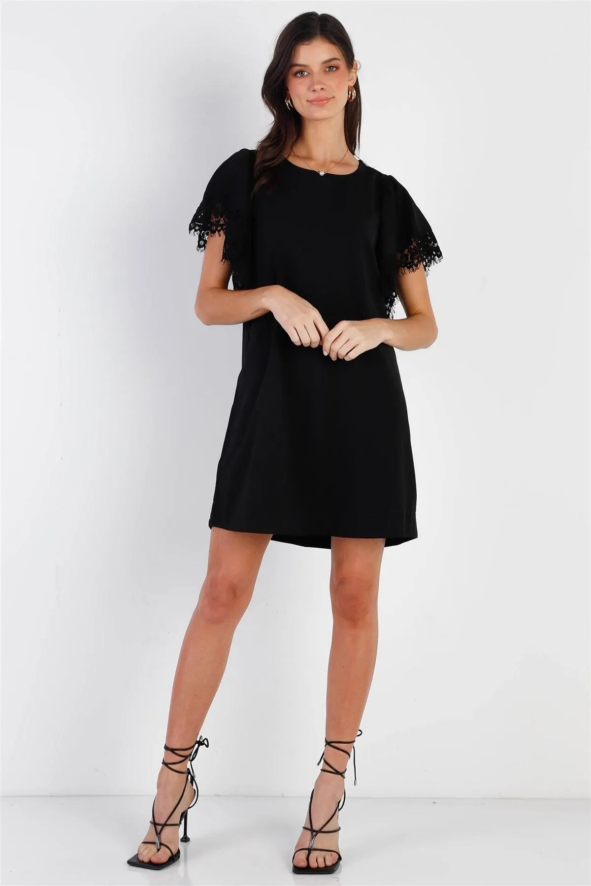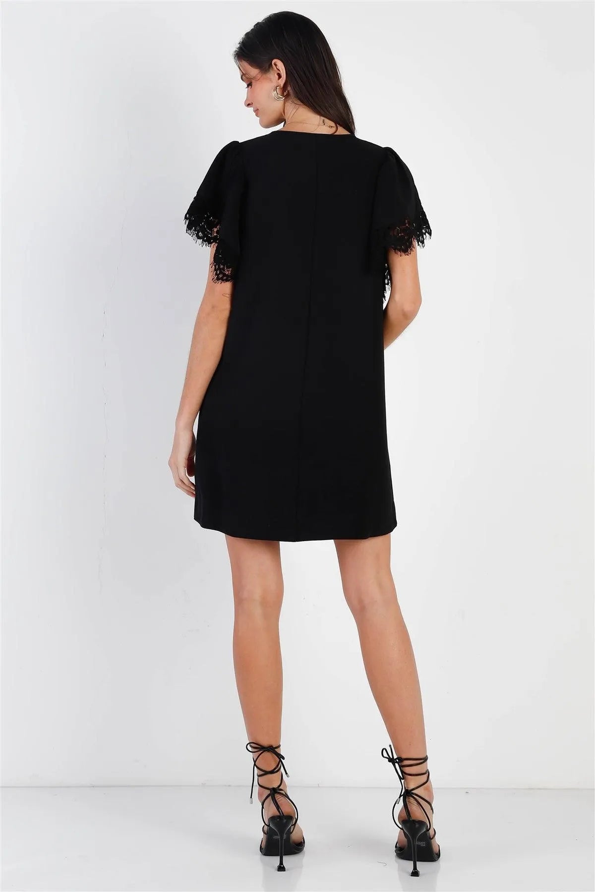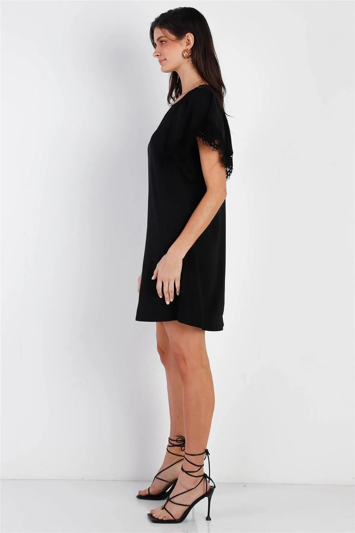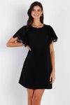 Black Relax Fit Lace Hem Wing Sleeve Round Neck Mini Dress /1-2-2-1
