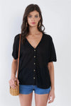 Black Relaxed Fit V-neck Front Button Down Top /2-2-2