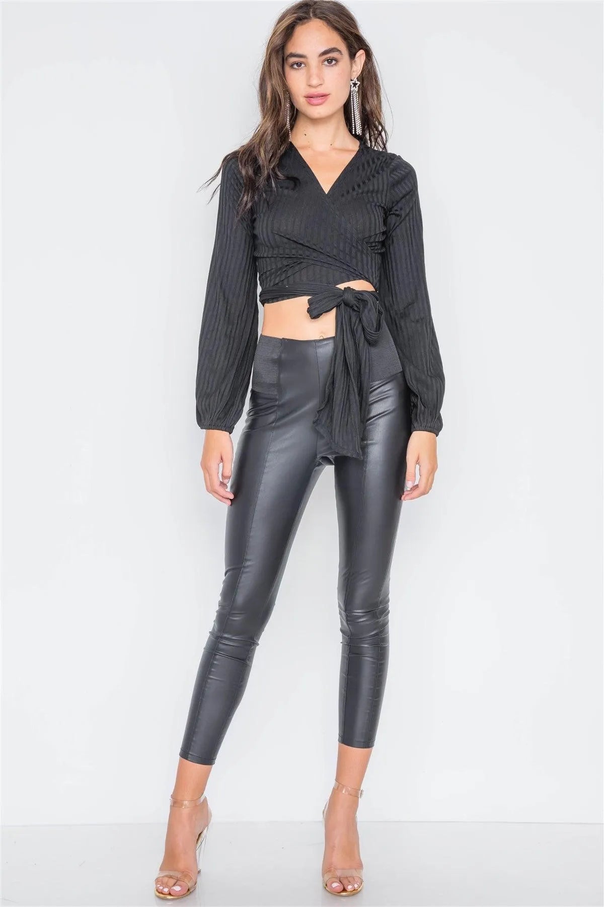 Black Ribbed Long Sleeve Wrap Knit Crop Top /3-2-1