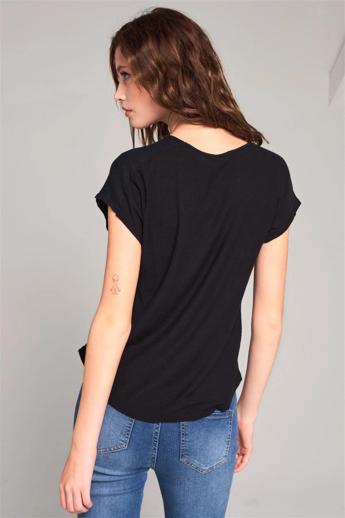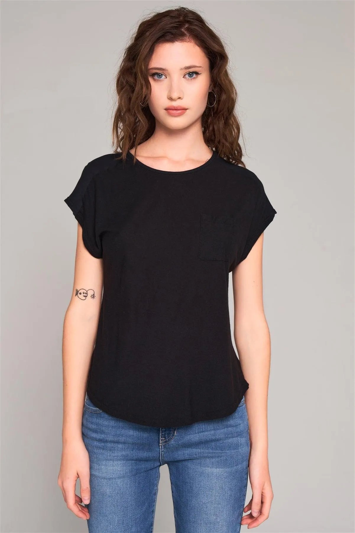 Black Ribbed Shoulder Round Neck Chest Pocket Detail Relaxed Tee /1-2-2-1