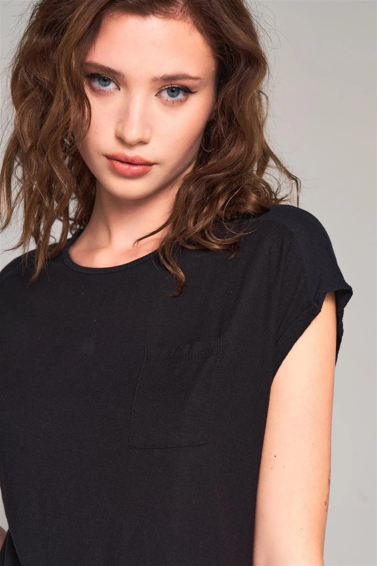 🖤Item Features: Black, solid, mini sleeve, ribbed shoulder detail, round neckline, front chest pocket detail, relaxed fit, unlined, stretchy, non-sheer, basic, casual, comfy, breathable, eco, sportswear, activewear, yoga & gym look, minimalistic design, spring/summer collection