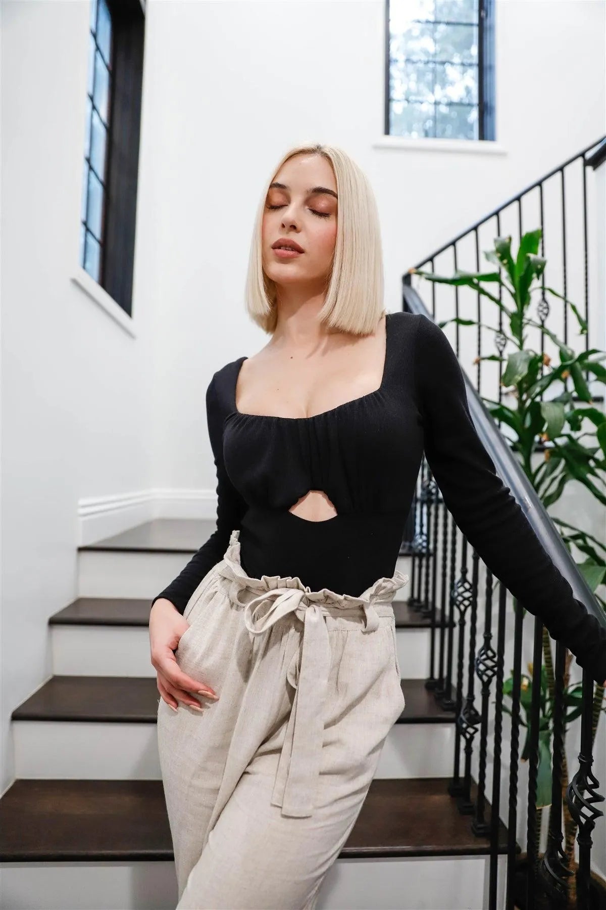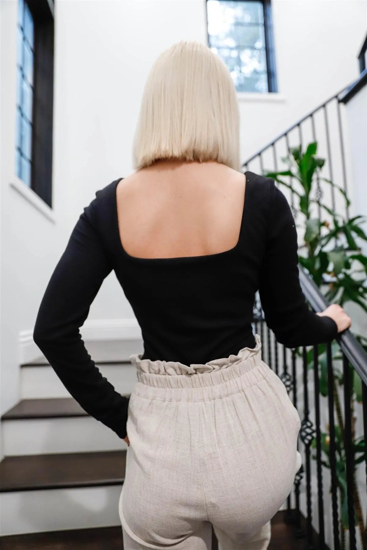 Black Ribbed Square Neck Cut-Out Detail Long Sleeve Bodysuit /2-2-2