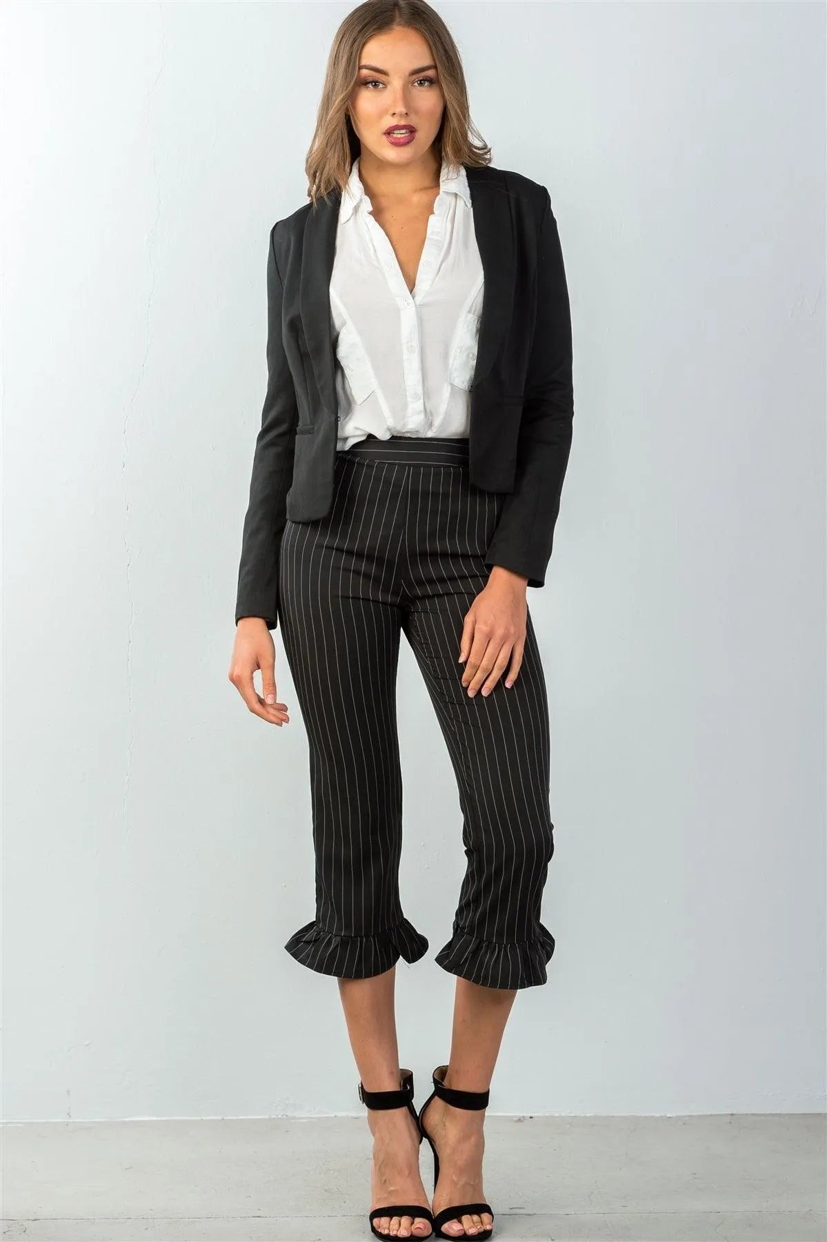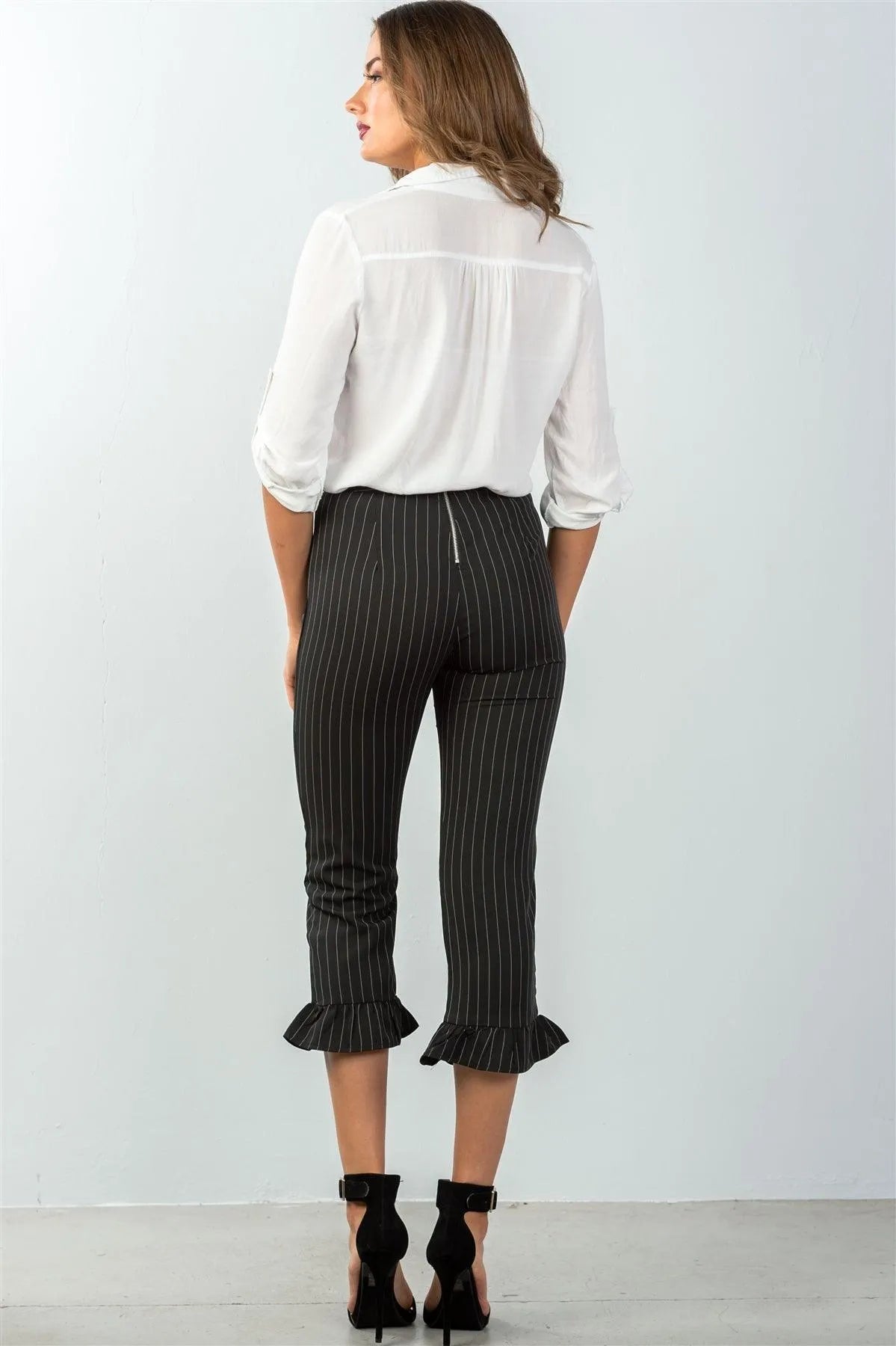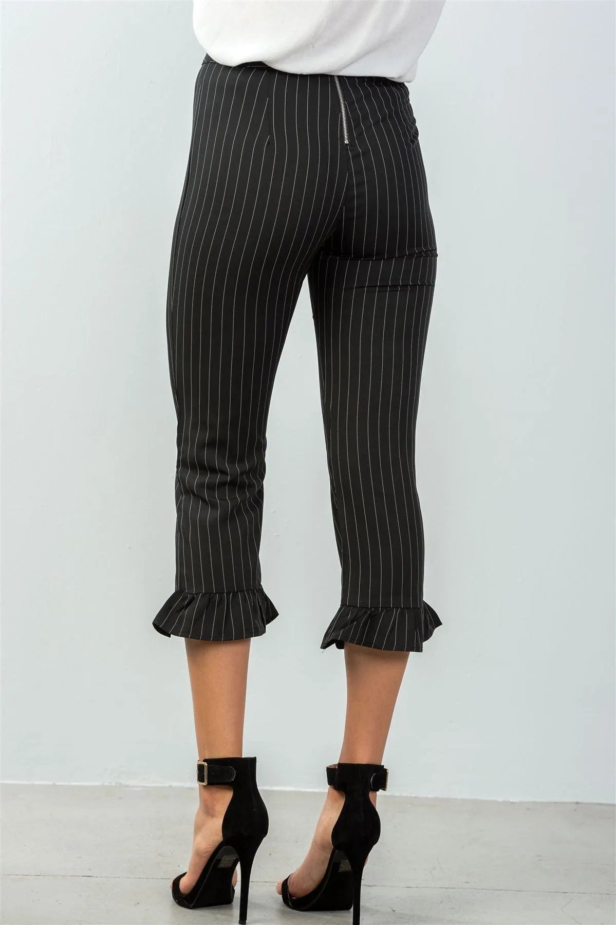 Pants features: allover pin stripe, straight cut, high waisted, back zipper and hook-and-eye closure, ruffle hem, cropped length.Model is 5'9" and wearing a Small (Waist 26", Bust 34A", Hips 37")Item measurements: Length: 34'', Waist: 28"