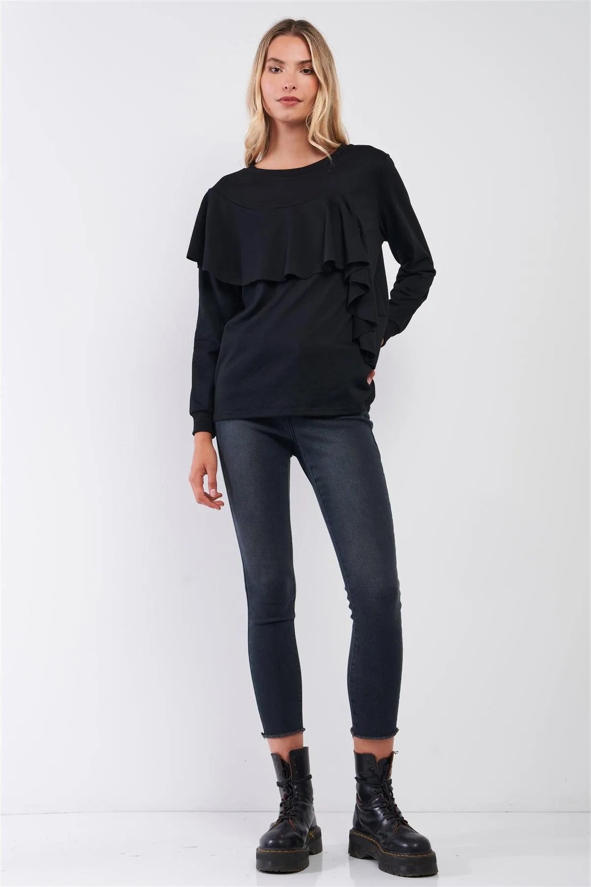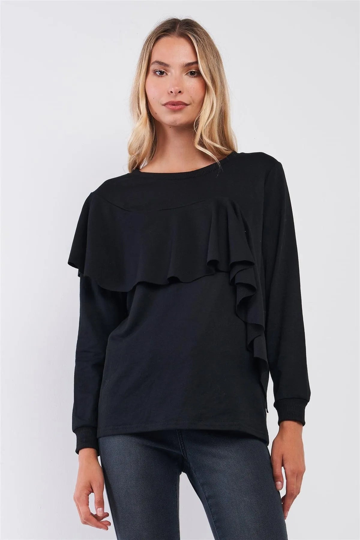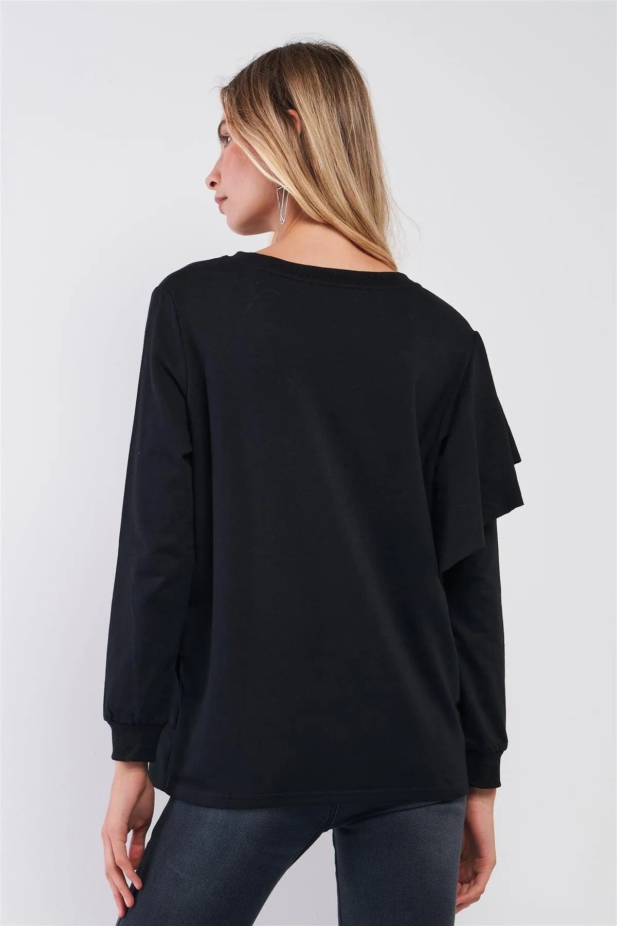 Black Ruffled Crew Neck Long Sleeve Sweatshirt /2-2-2