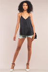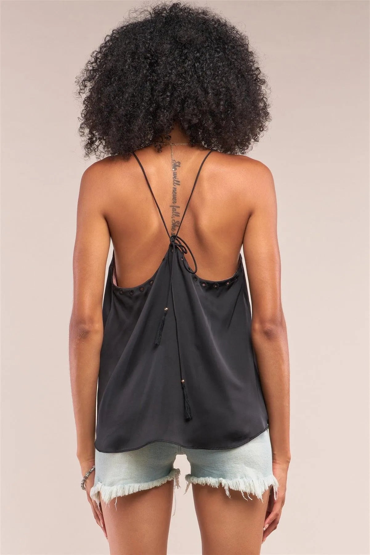 Black Satin Sleeveless Keyhole V-Neck Razor Back Self-Tie Tassel Tip Straps Detail Babydoll Top /1-2-1