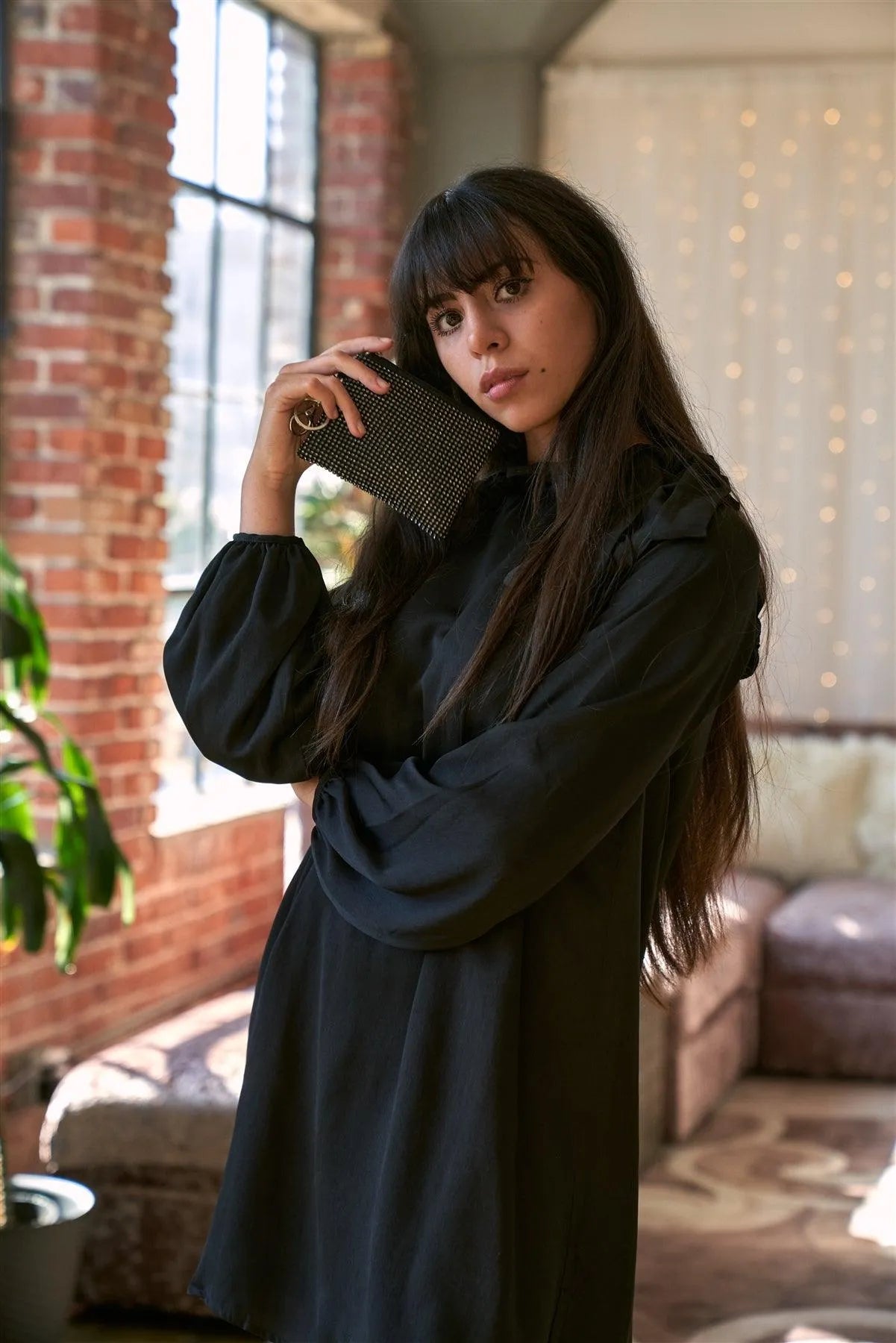 Black Satin Long Balloon Puff Sleeve Side-Tie Mini Dress /2-3-2