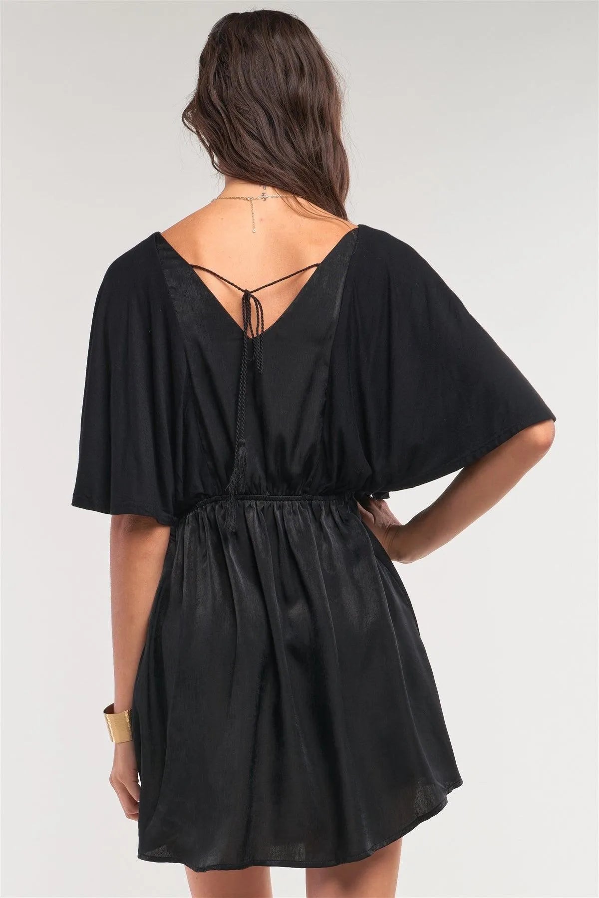 🖤 Item features: Black, solid, mixed satin & cloth, tassel tip mini rope self-tie back neckline, angel wing short sleeve, elasticized back waistline, pleated, loose fitting, unlined, semi-stretch, mini length, casual, silky feel, classy, elegant, sophisticated, cocktail party wear, date night, all new fall/winter