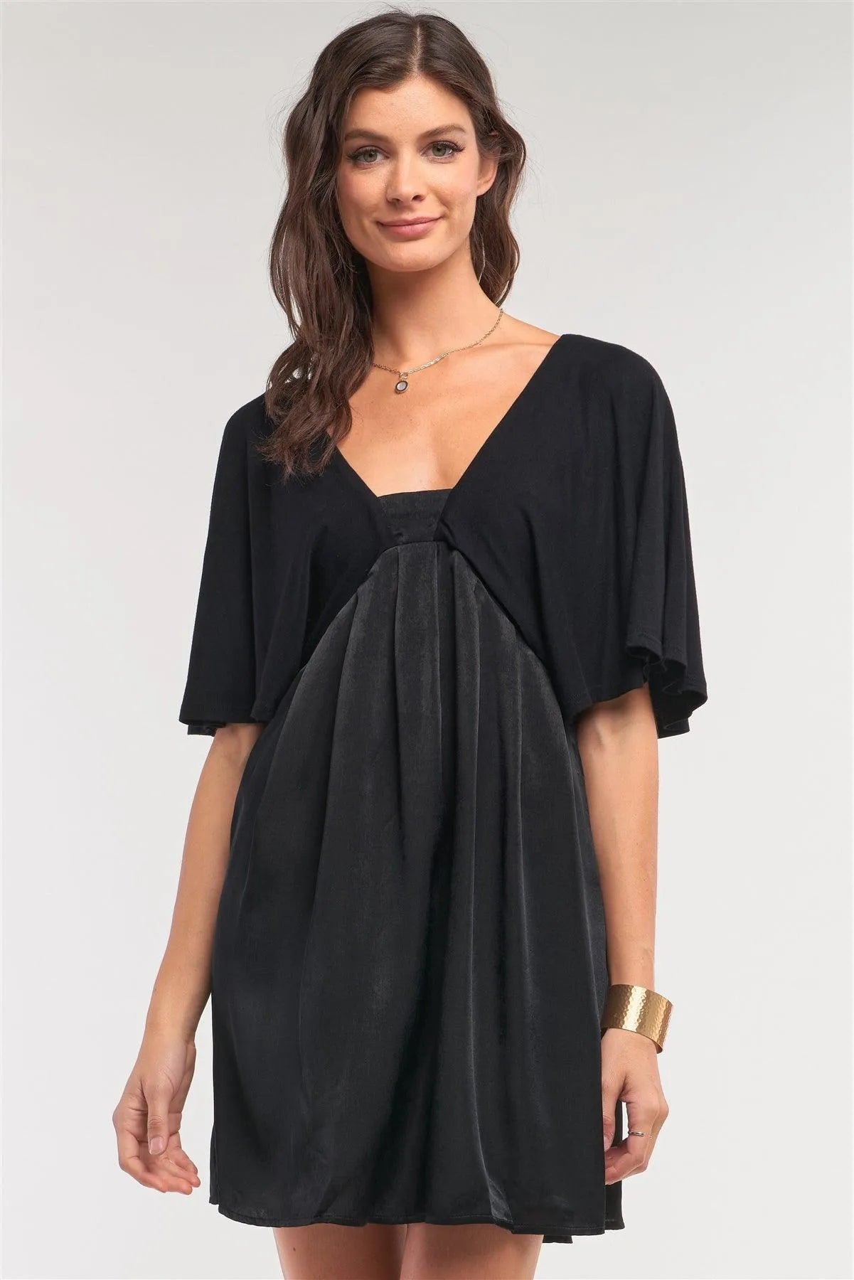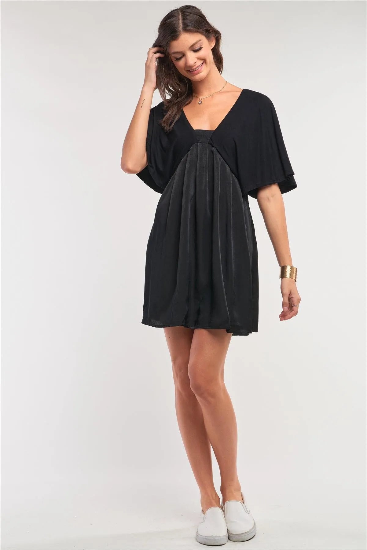 Onyx Black Satin Self-Tie Back Neck Angel Sleeve Pleated Mini Dress /1-2-2