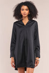 Jet Black Satin V-Neck Long Sleeve Relaxed Fit Shirt Dress /1-2-2-1