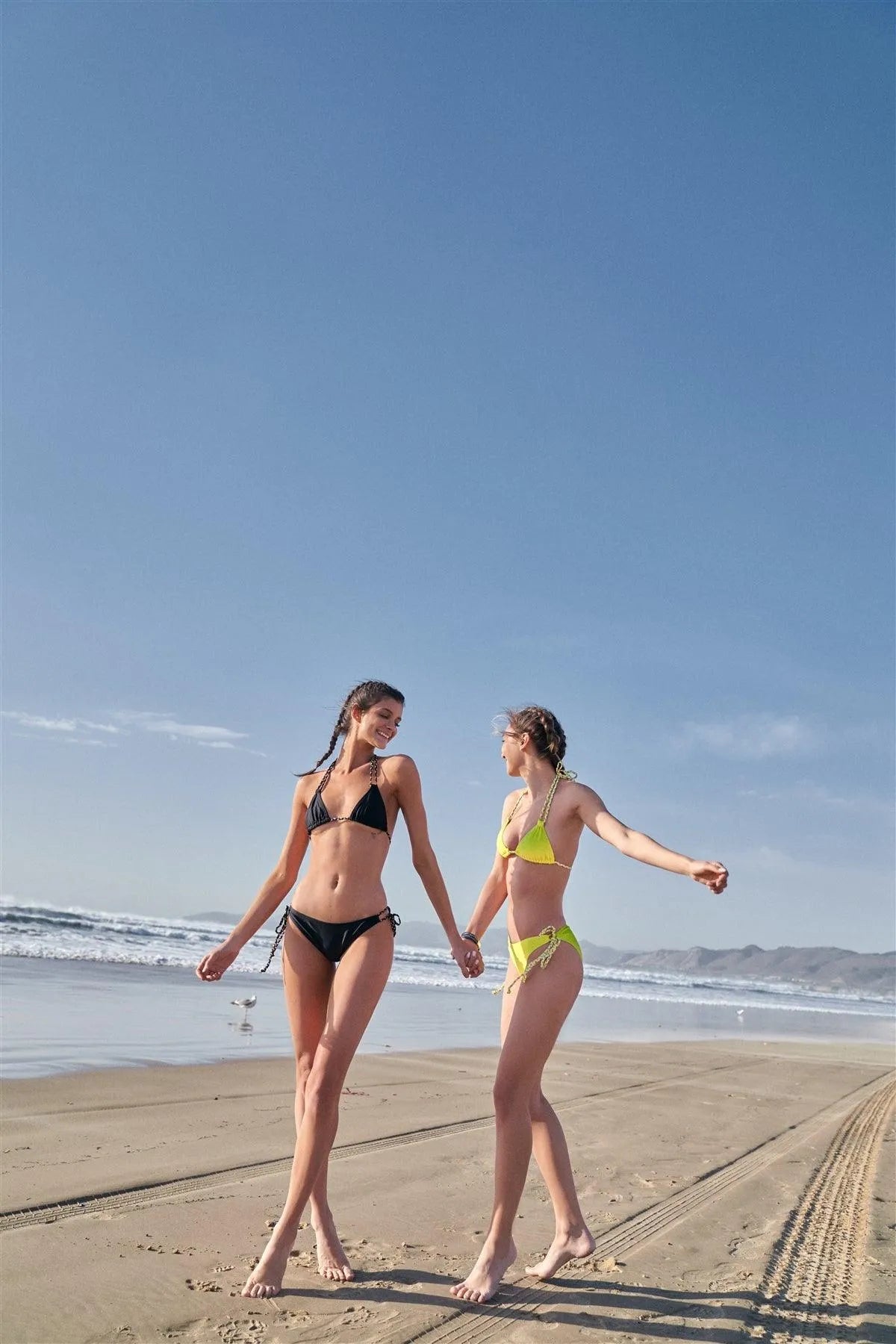 🖤Item Features: Black, triangle shape, open back, self-tie back and neck gold braid straps, side self-tie straps on bikini bottom, lined, stretchy, hot, sexy, color pop, festival wear, cute, new swimwear collection