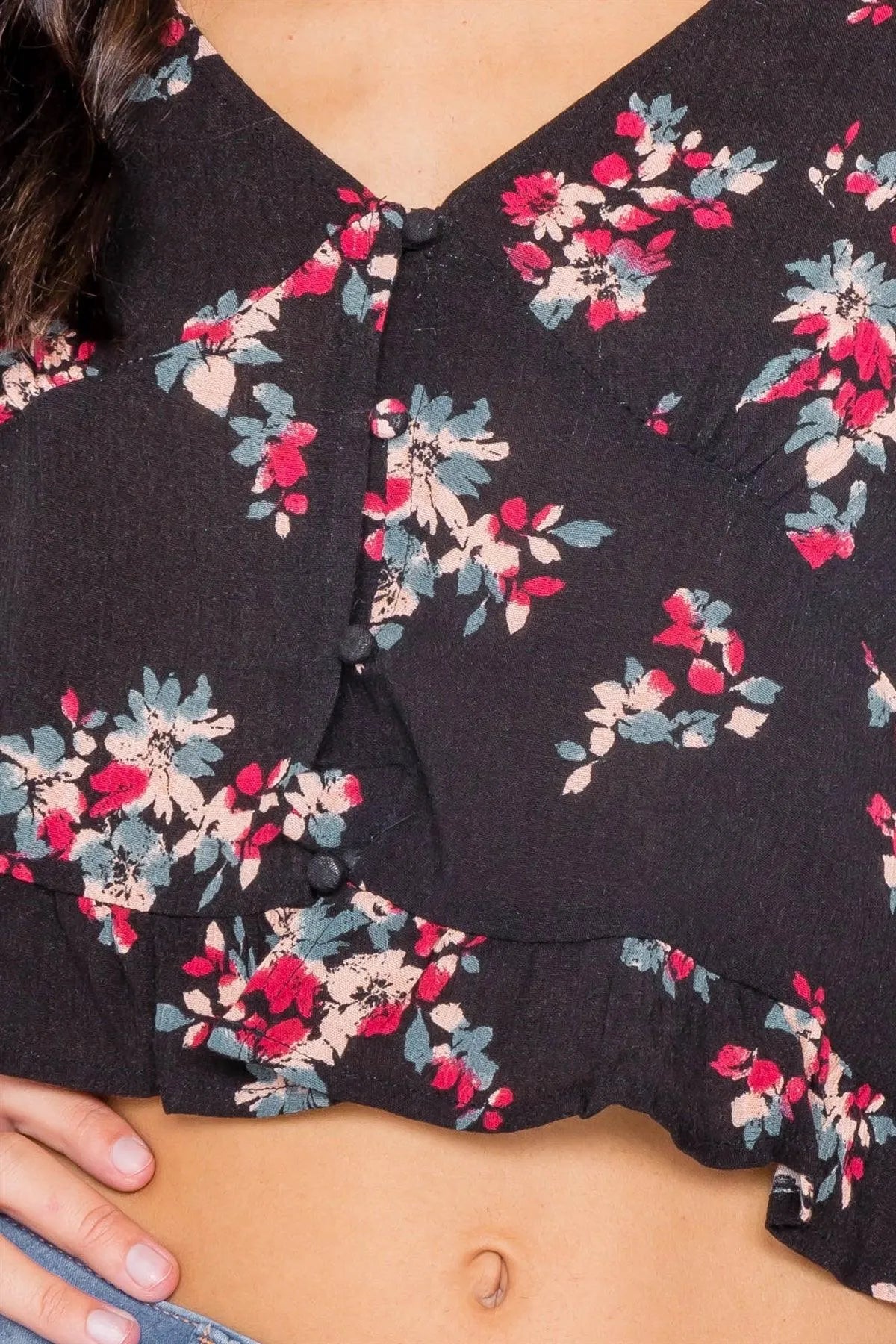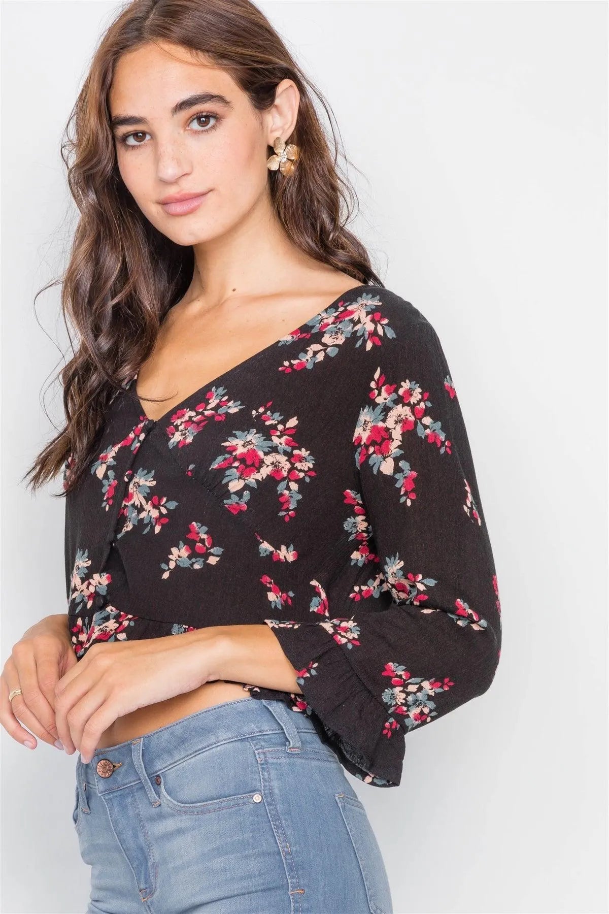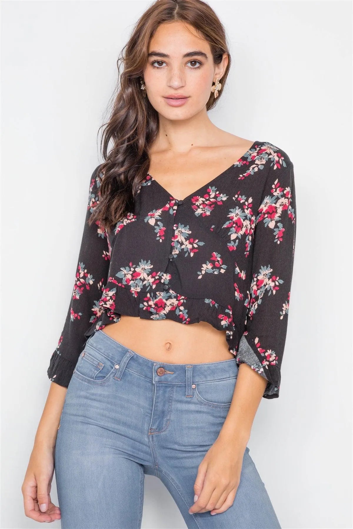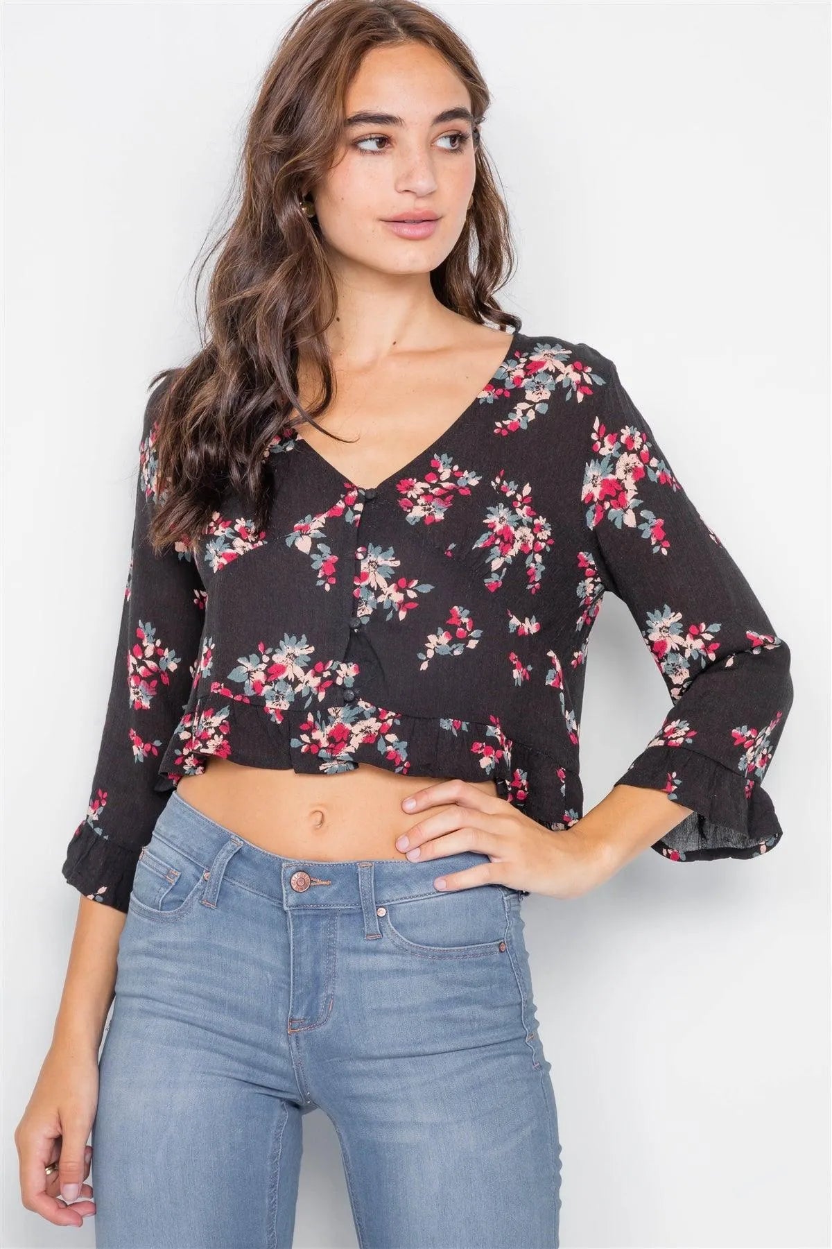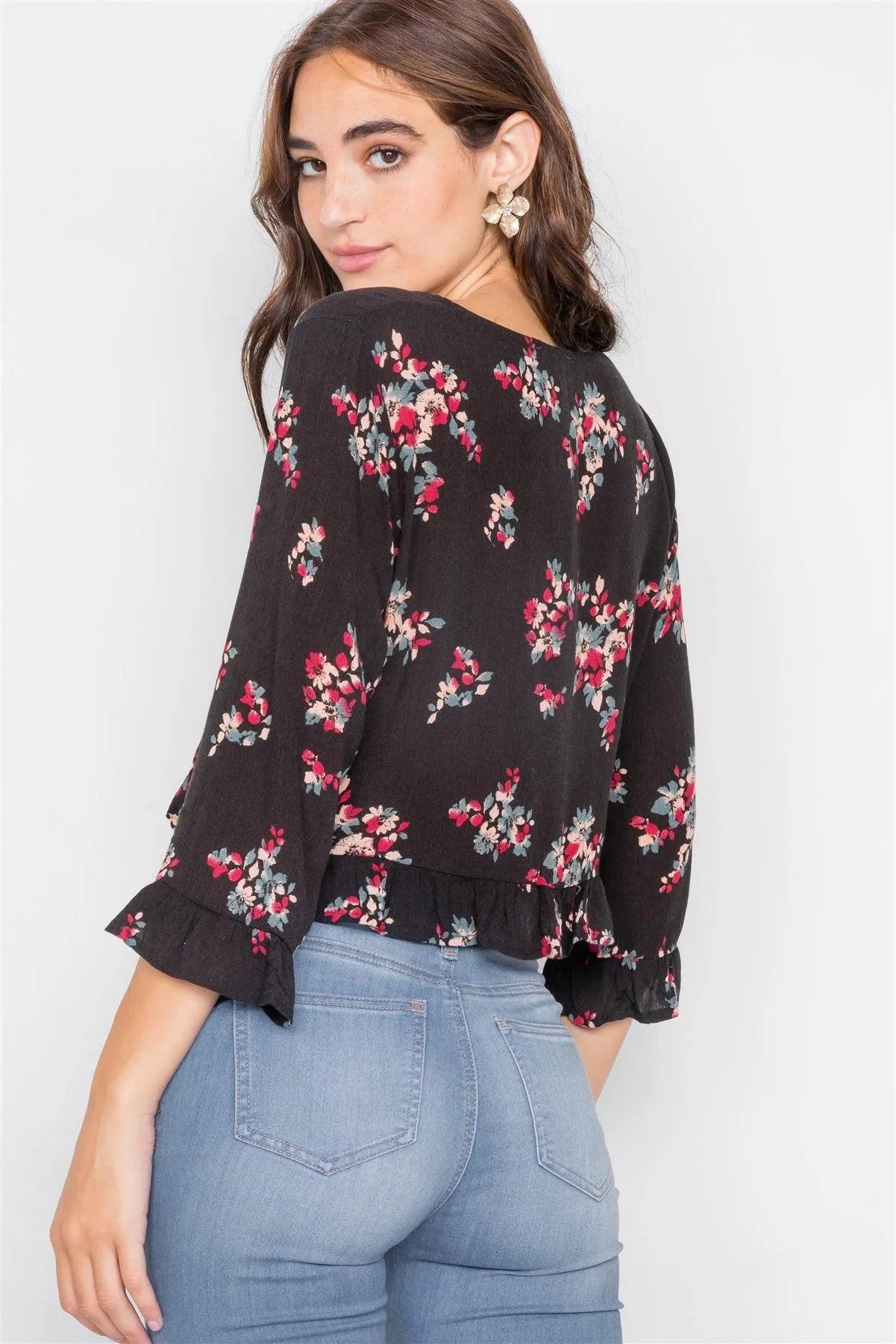 Black Semi-Sheer Floral High-Low Flounce Hem Blouse /2-2-2