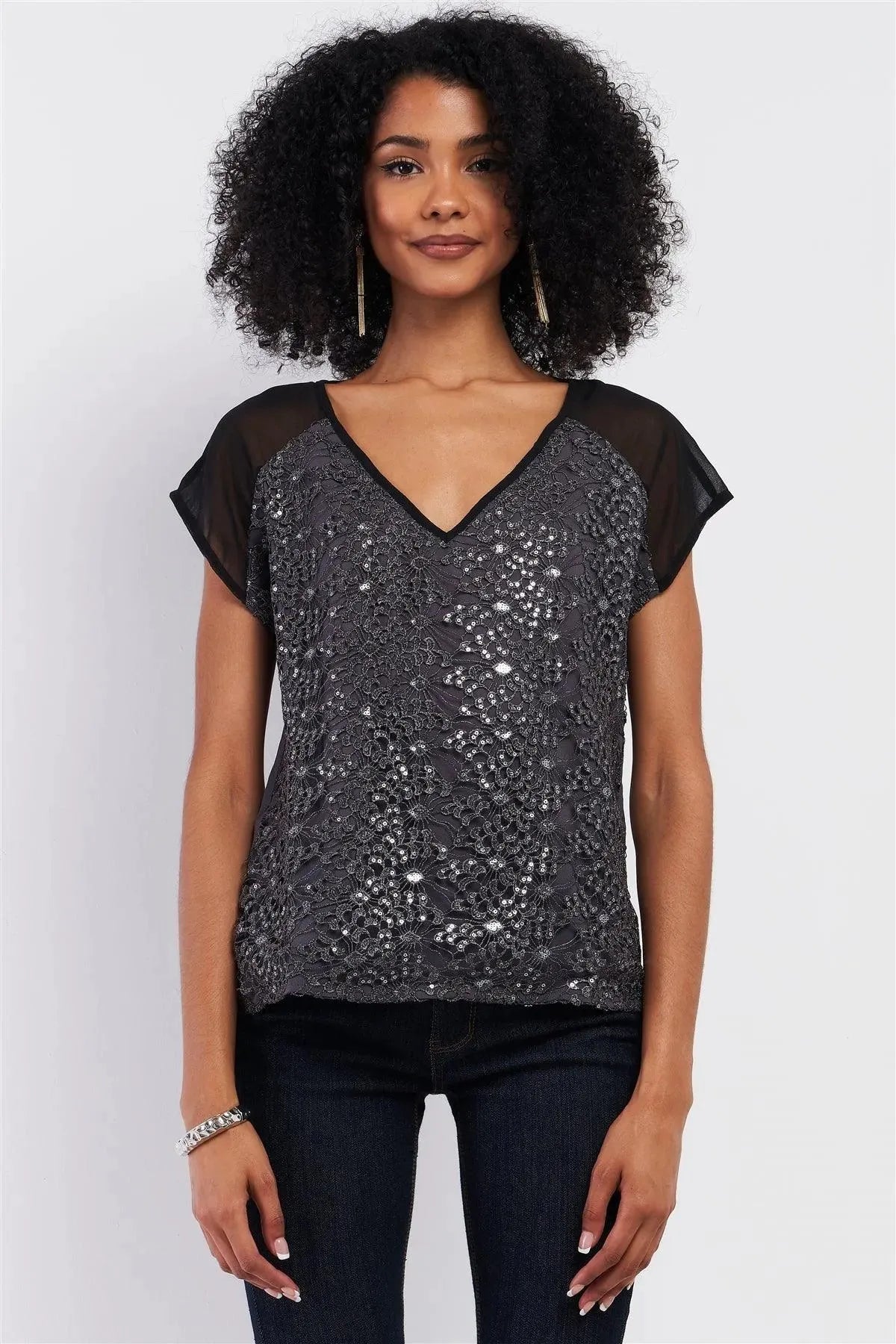 This chic and sexy Black Sequin V Neck Draped Sleeve Top is the perfect addition to your fall/winter collection. The black sequins and rhinestone details add a touch of glamour, while the draped open sleeves provide a stylish and comfortable fit. Perfect for a holiday look or a night out on the town. Stay on trend with this fitted and non-sheer top, complete with a back hidden zipper closure.