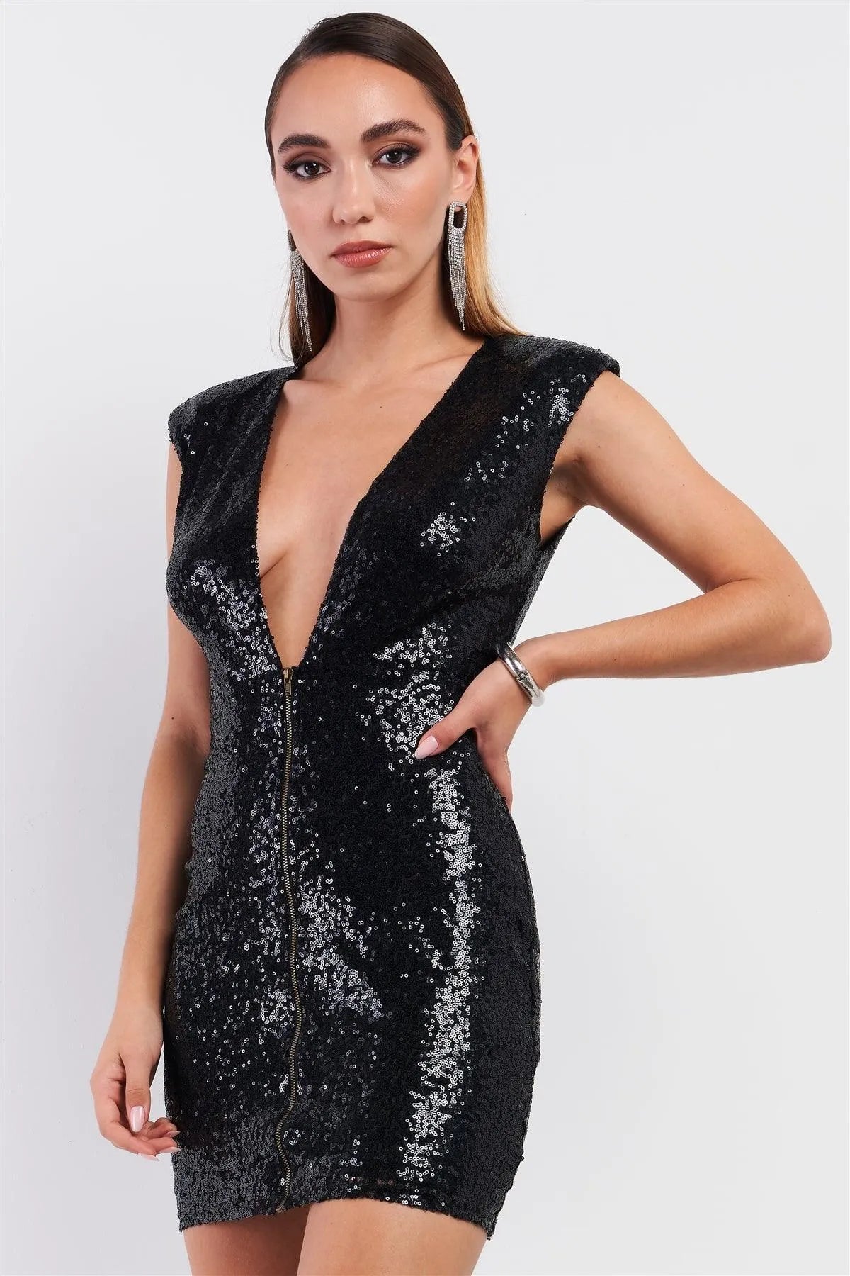 Black Sequin Sleeveless Deep Plunge V-Neck Front Zip-Up Detail Mini Dress /3-2-1
