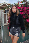 Black High Neck Shearling Vegan Leather Detail Cropped Moto Bomber Jacket /3-2-1