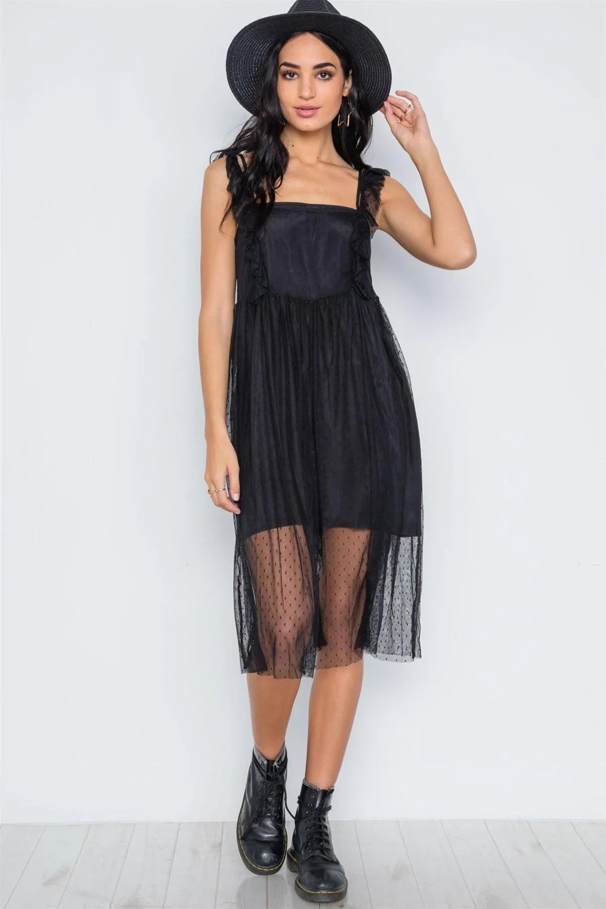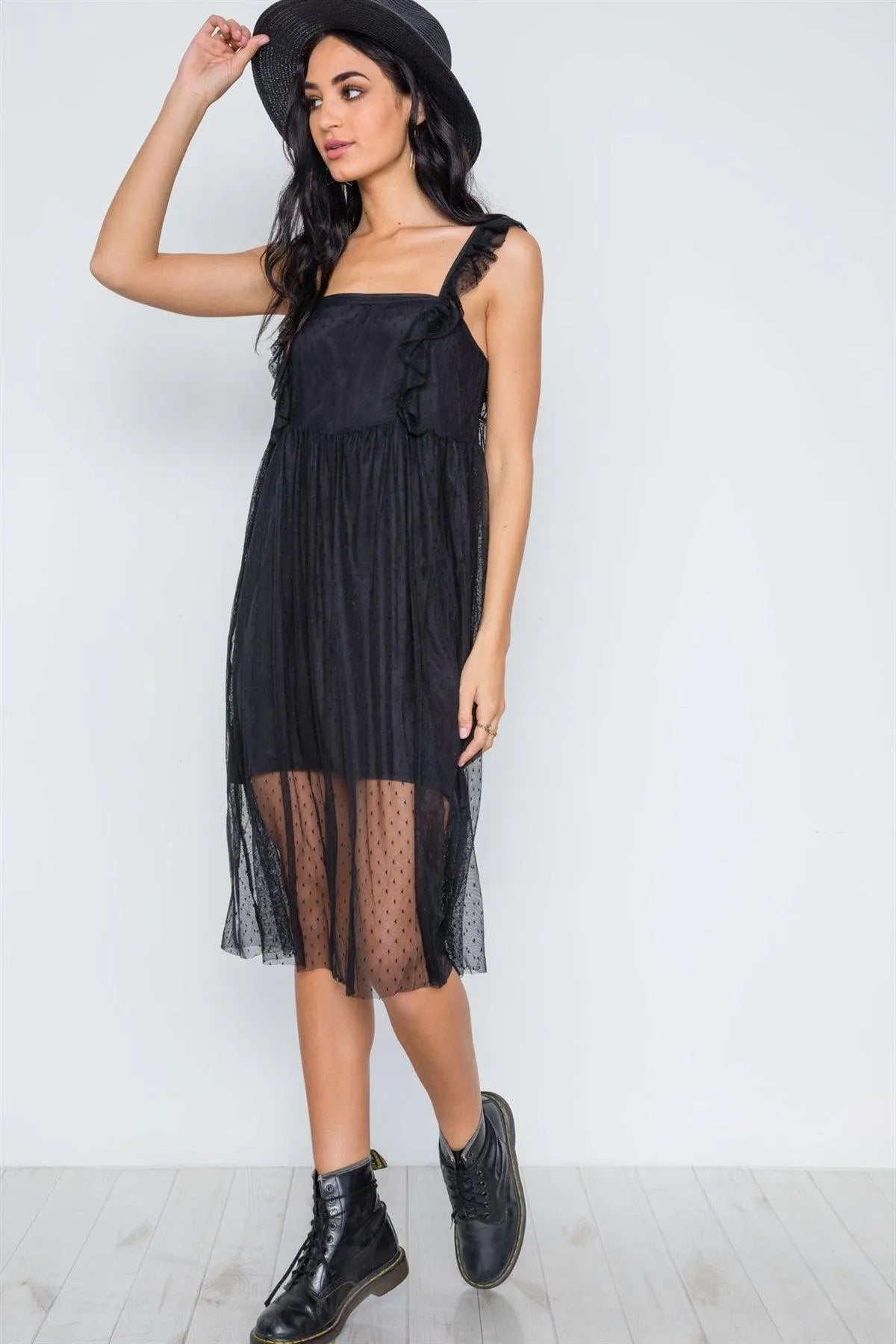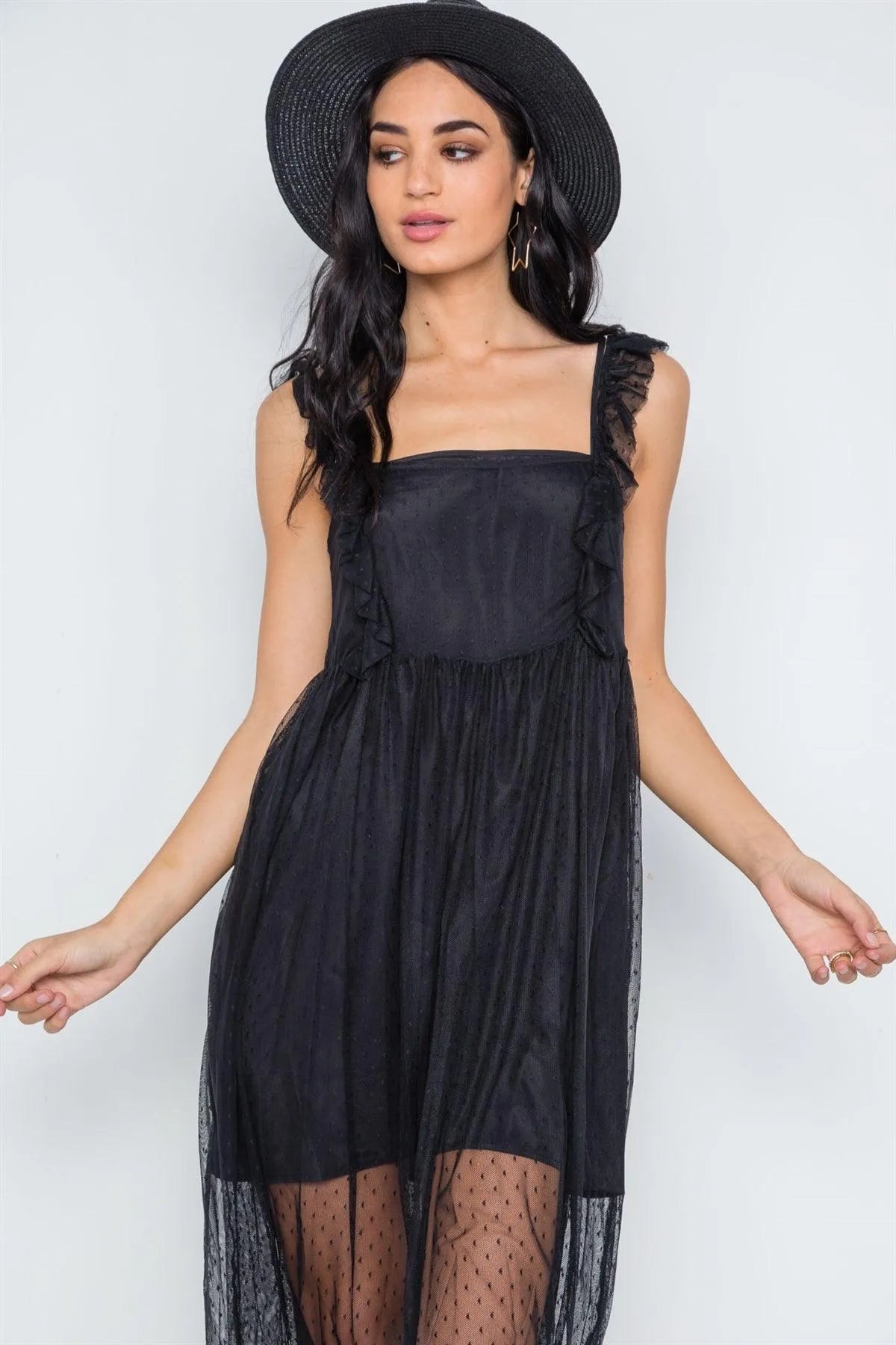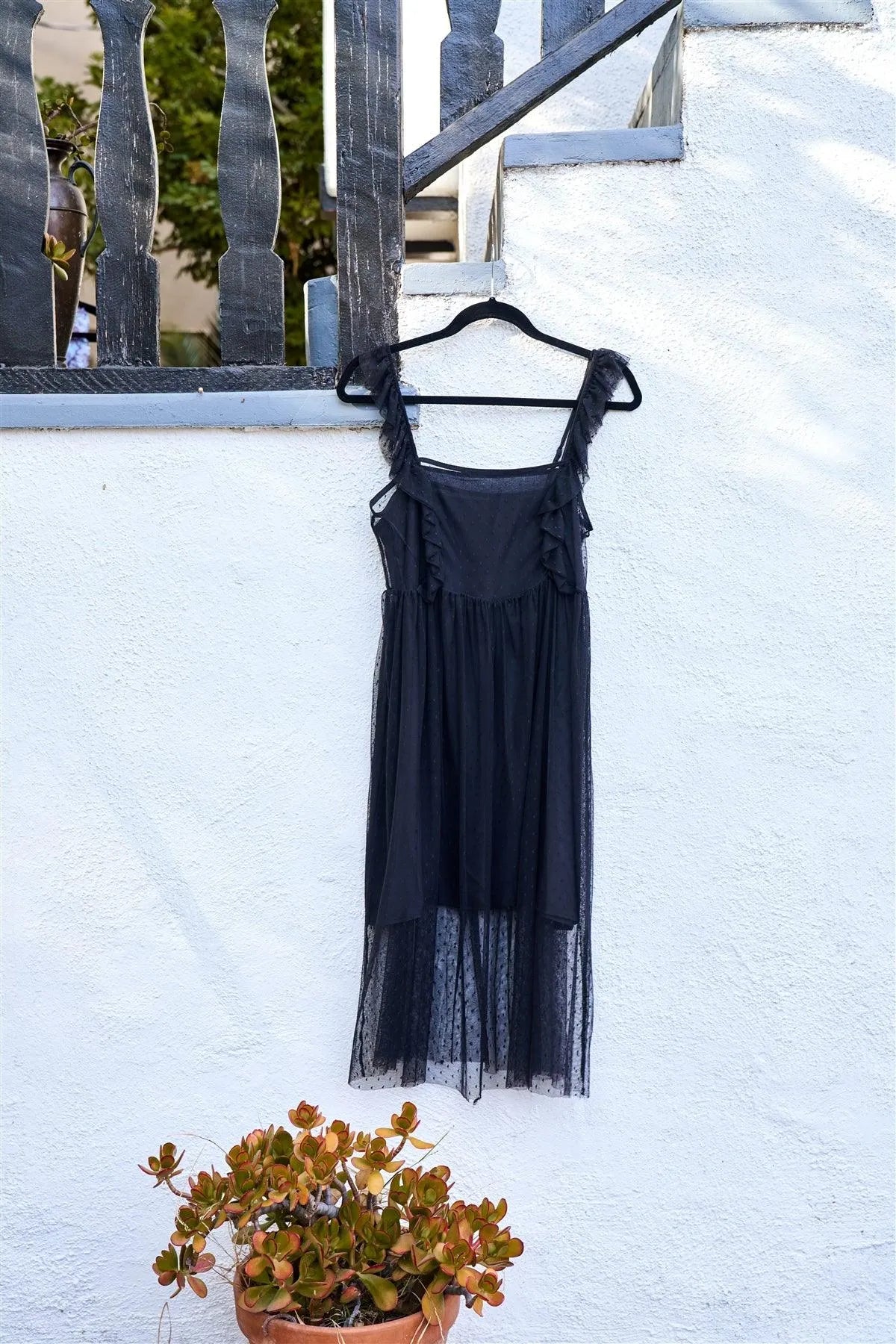 Black Sheer Dotted Mash Ruffle Midi Dress /3-2-1