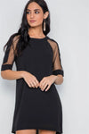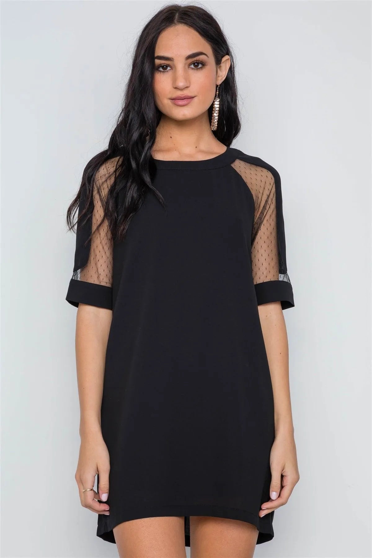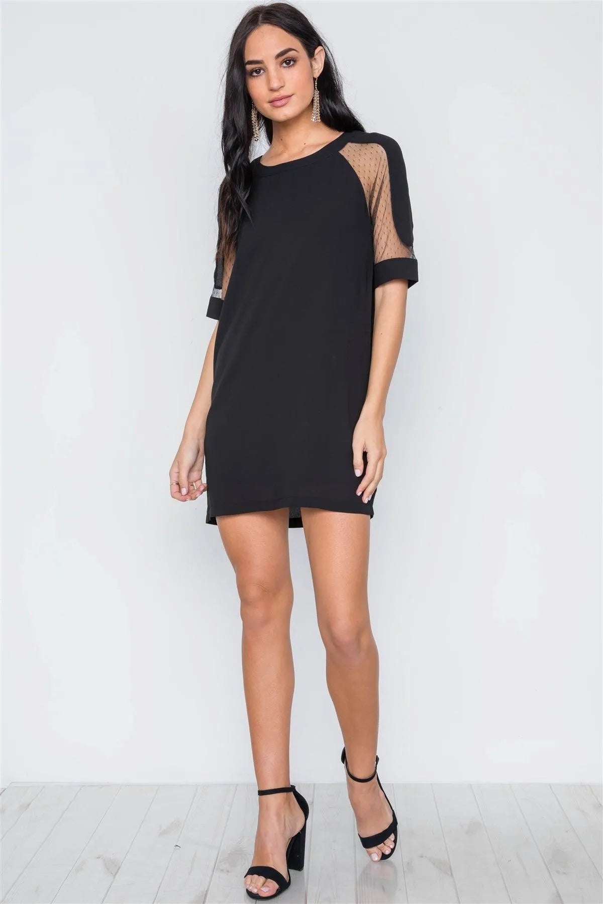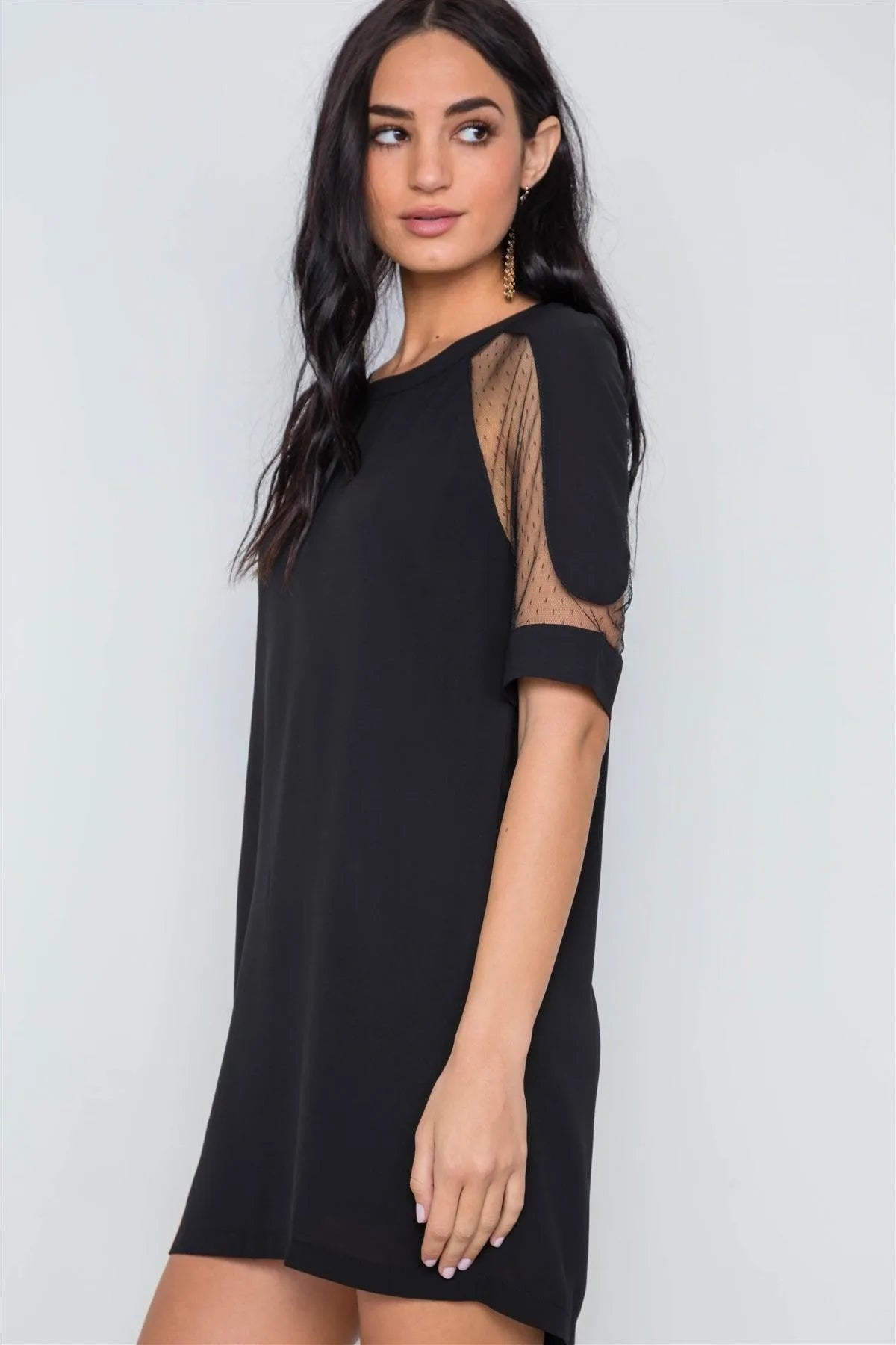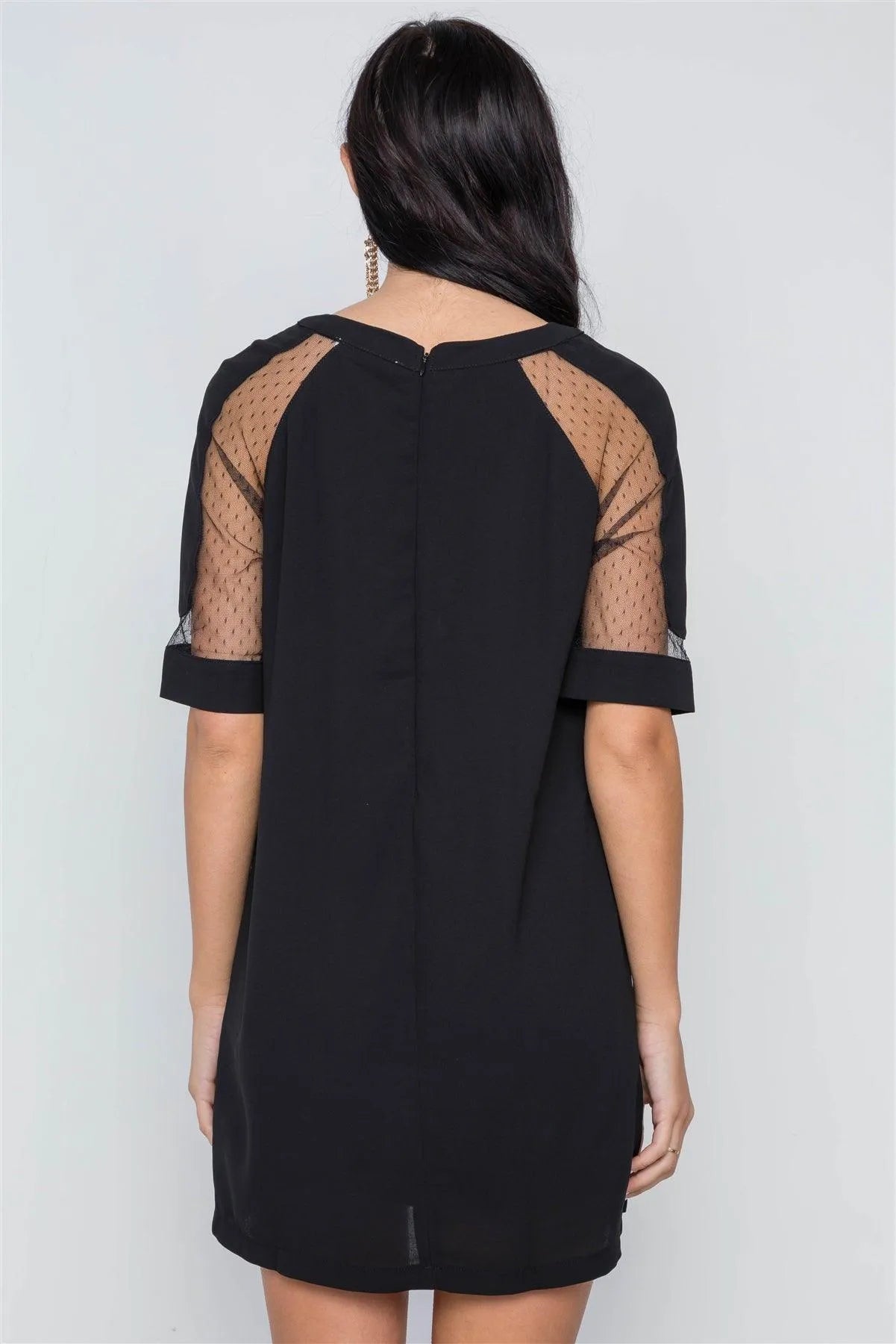 Black Sheer Dotted Sleeves Mini Shirt Dress /4-2