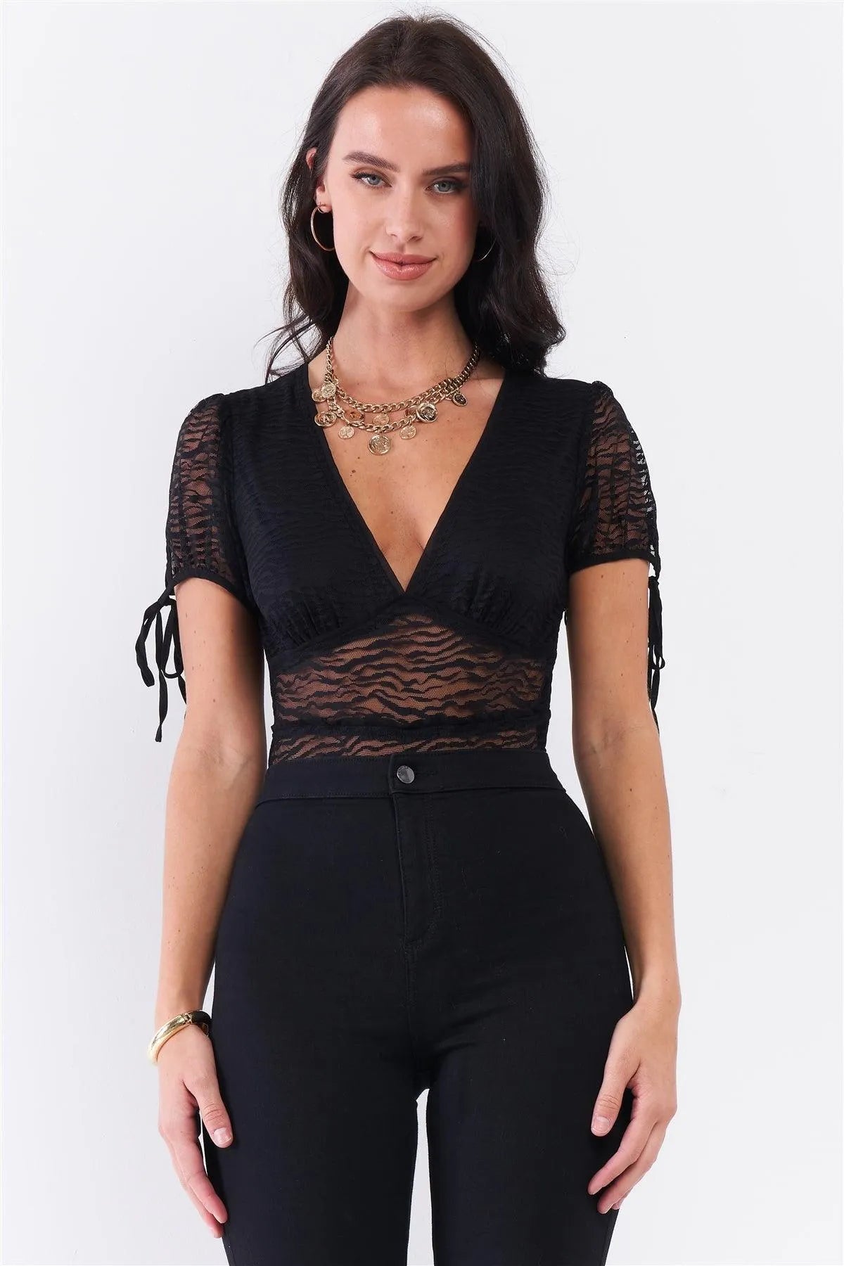 Black Sheer Mesh Deep Plunge V-Neck Short Sleeve Bodysuit /3-2-1
