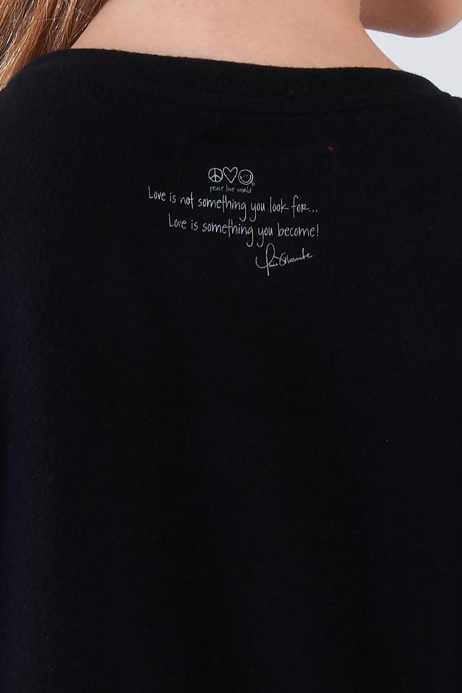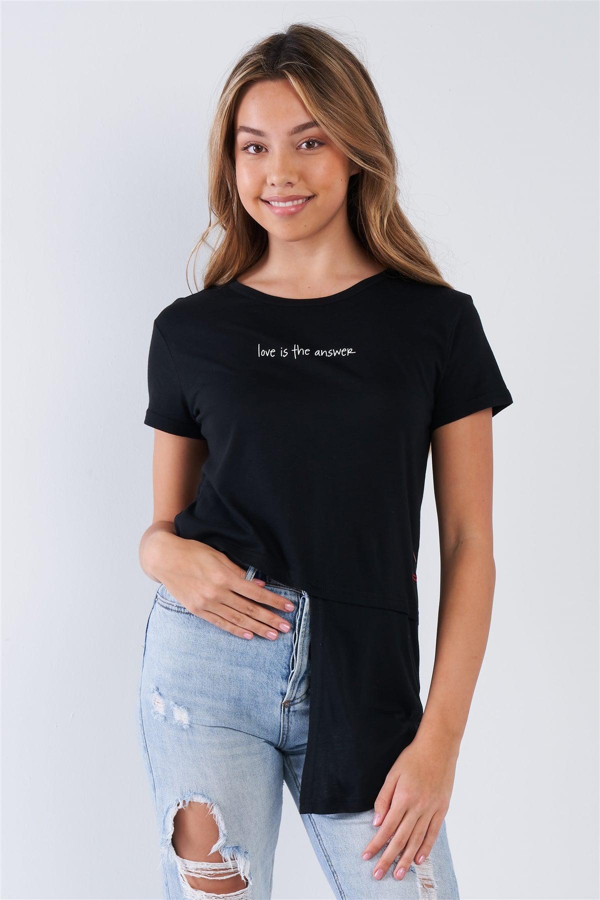 Stay uplifting and stylish with our wholesale graphic top featuring empowering messages: "Love is not something you look for... Love is something you become!" on the back and "Love is the answer" on the front. This trendy asymmetric t-shirt combines comfort with meaningful design, perfect for boutiques catering to conscious fashion lovers.