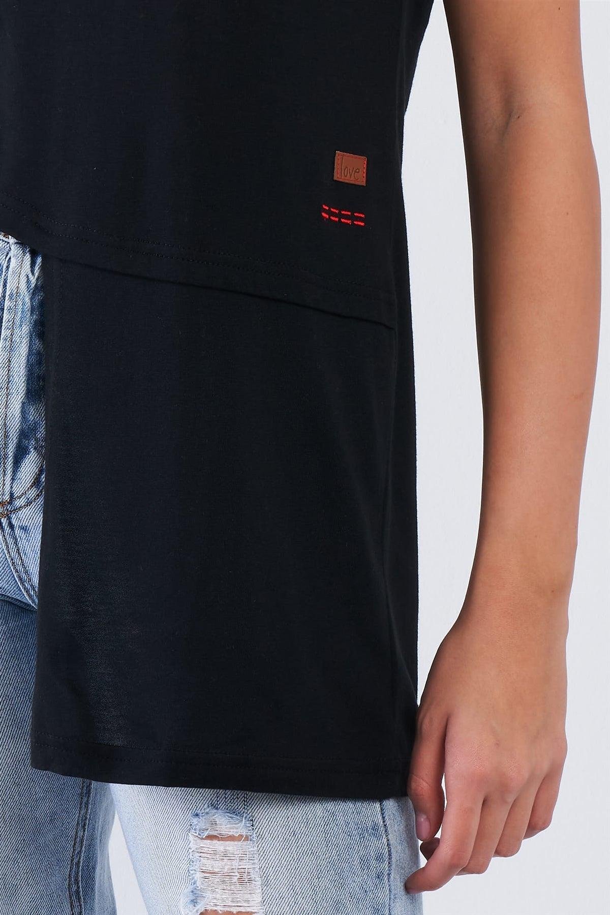 🖤 Features: Premium cotton blend, asymmetric hem design, comfortable crew neckline, short sleeves, inspirational text graphics, leather love tag detail, relaxed fit, easy-care fabric