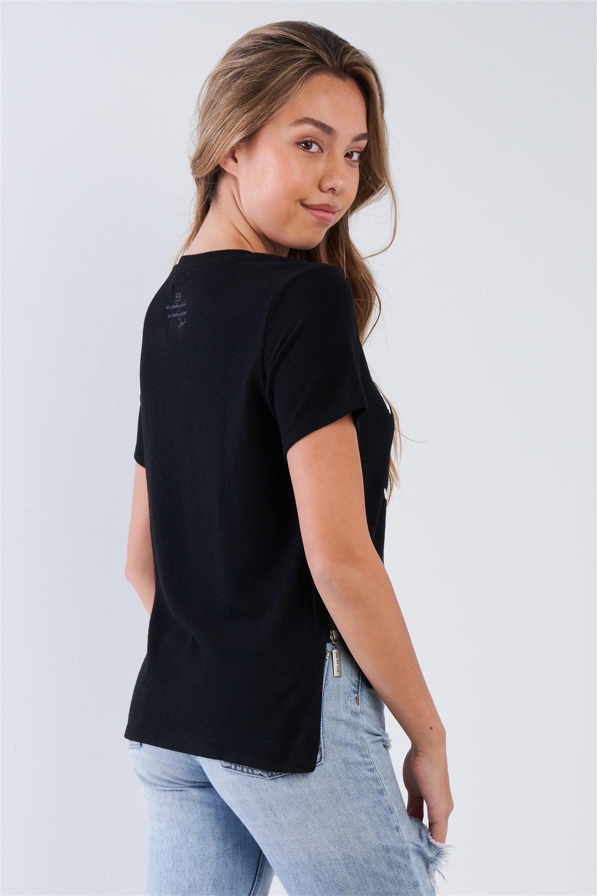 Black Short Sleeve "Love Is The Answer" Asymmetrical Hi-Lo Hem Top / 1-1-1