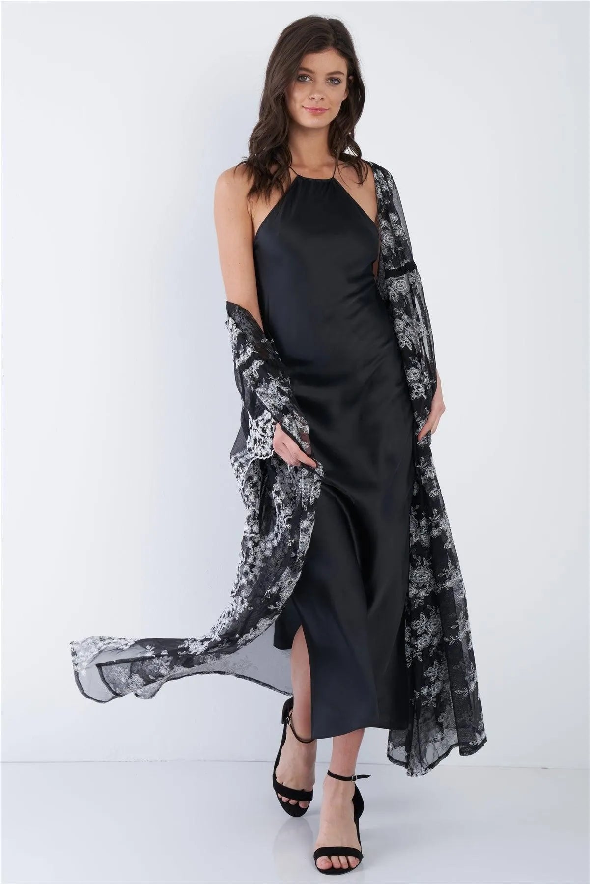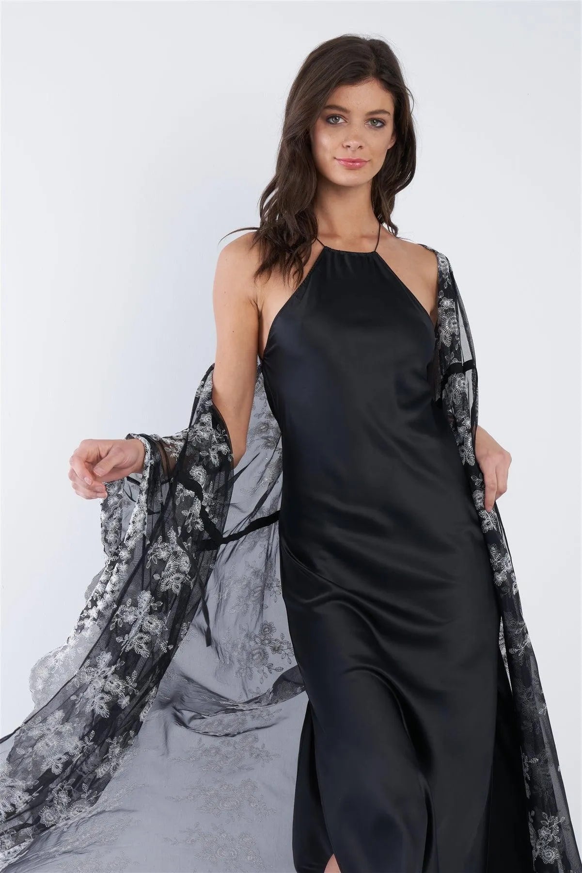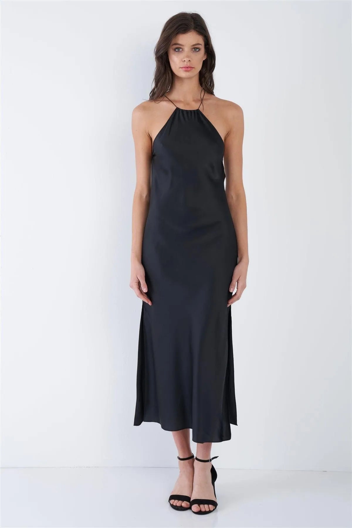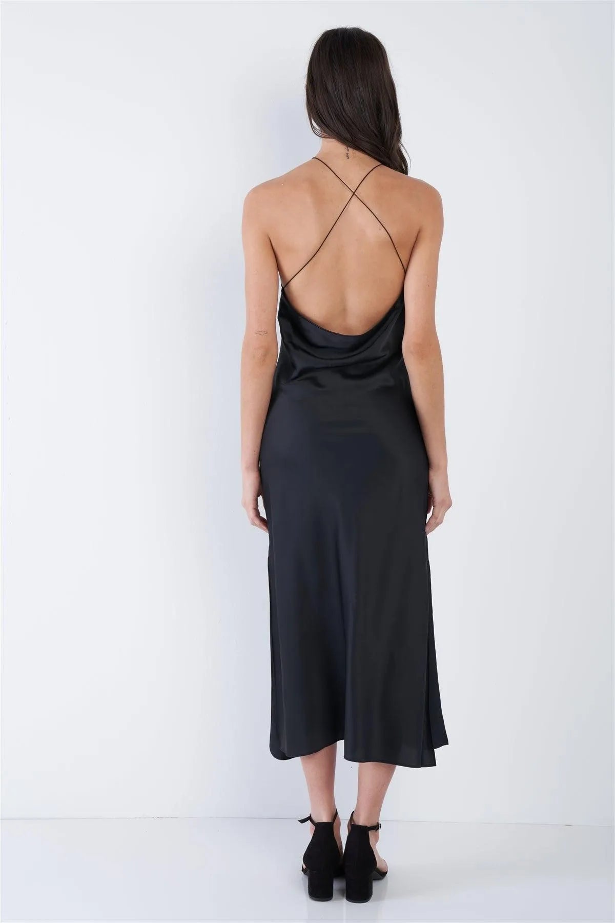 Black Silk Halter Side Slit Criss-Cross Open Back Midi Dress /2-2-1